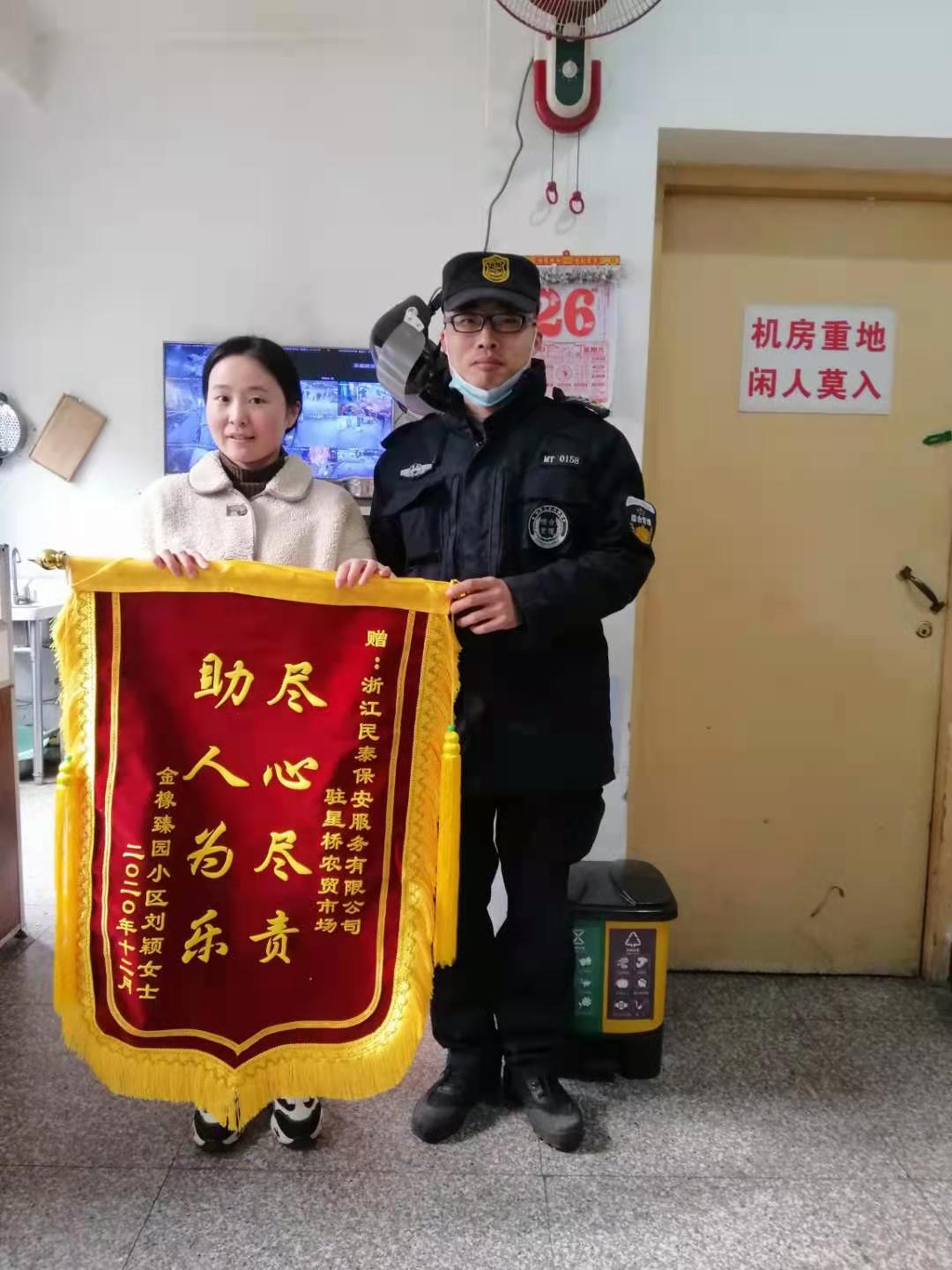 12月21日,星橋農貿市場(chǎng)項目隊員楊斌收到市民劉穎女士送來(lái)的一面繡有“盡心盡責 助人為樂(lè )”的錦旗,感謝楊斌為她找到了手機。