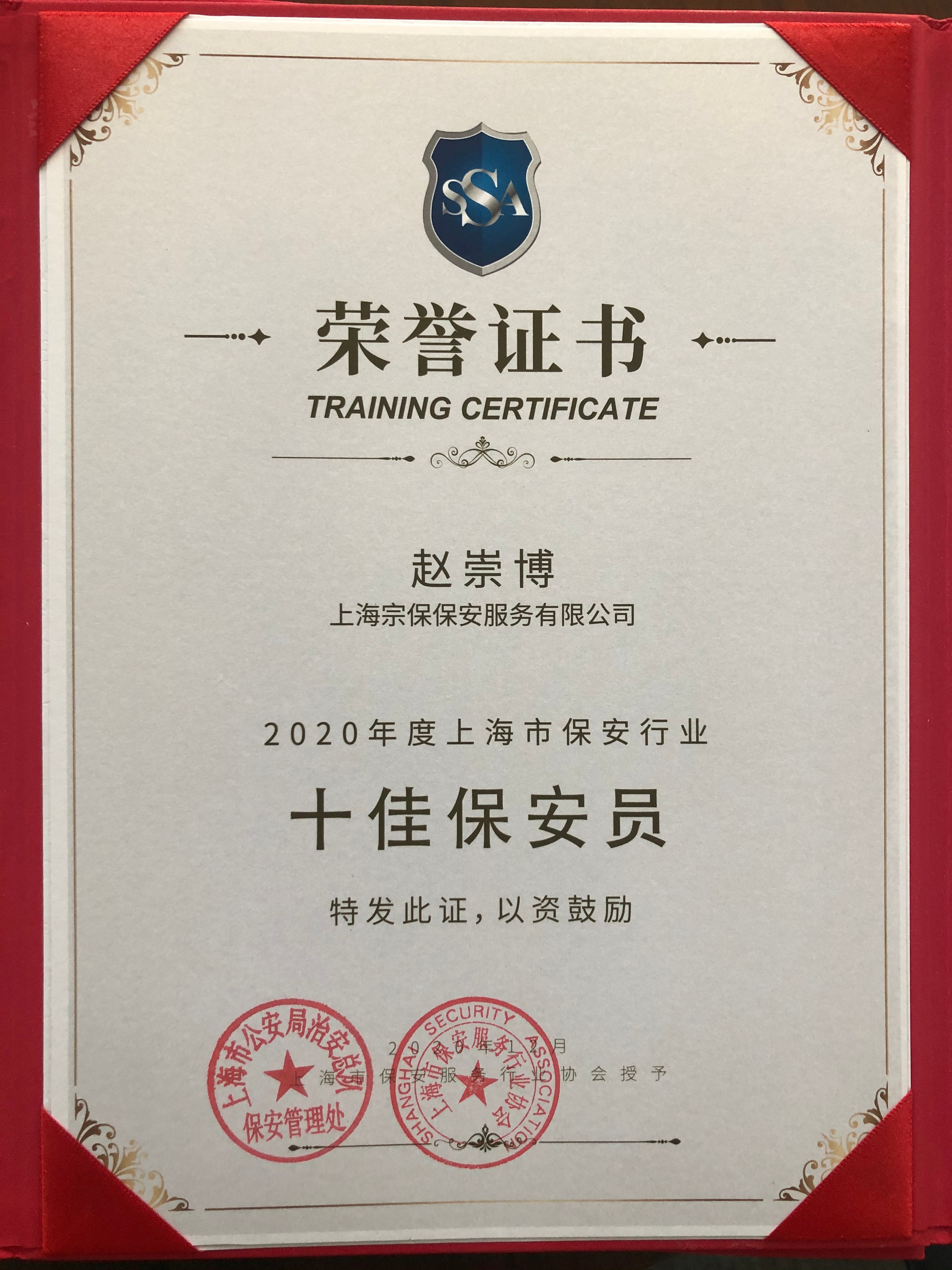 公司員工趙崇博被評為“2020年度上海市十佳保安員”。