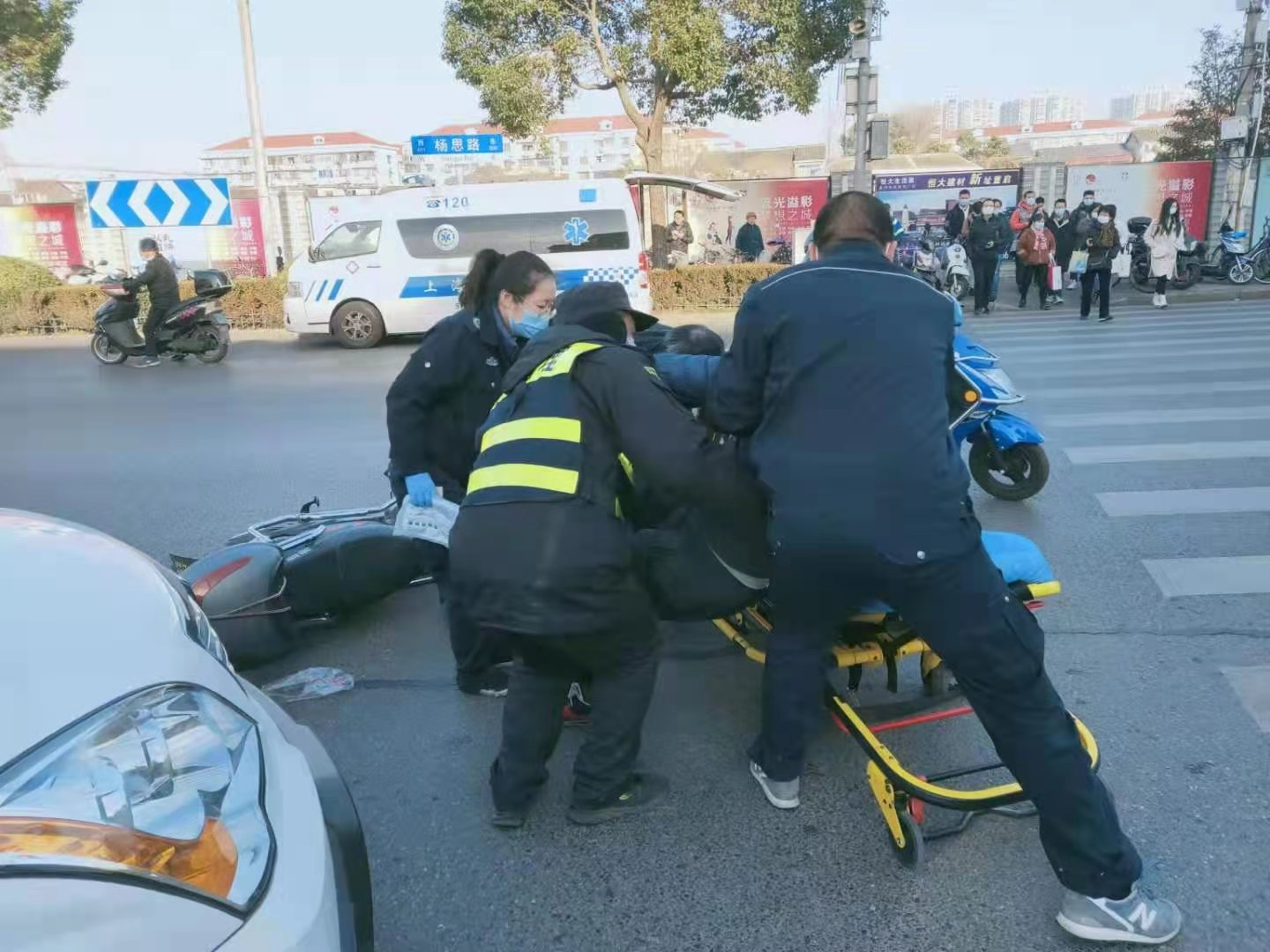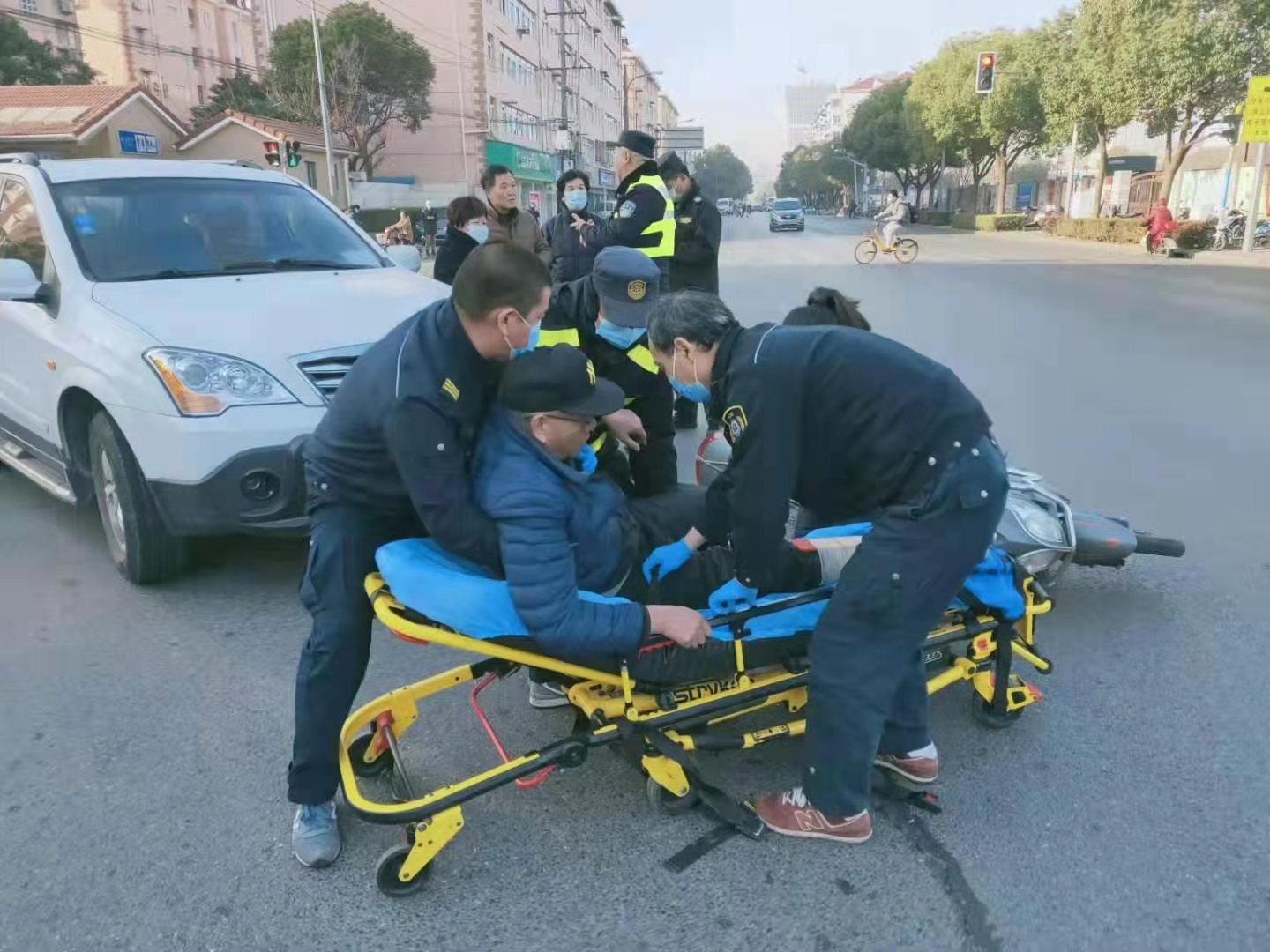 當天8:00,張展展巡邏至楊思路靈巖南路口時(shí),看到一位約60多歲的男子躺在機動(dòng)車(chē)道上,所騎乘的電動(dòng)車(chē)倒在其身旁。一輛小轎車(chē)停在旁邊,車(chē)主站在車(chē)旁,顯得手足無(wú)措。