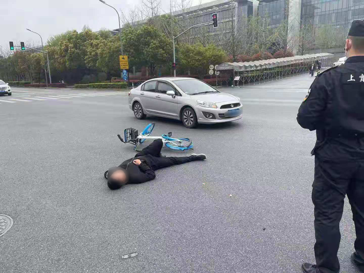 當天9:10左右,盧迎輝在新金橋路金蘇路華為南門(mén)早高峰值勤時(shí),遇到一起交通事故,一位騎單車(chē)的男子與行駛中的小轎車(chē)相撞,男子當即被撞出去三四米遠,倒在地上抽搐不止。
