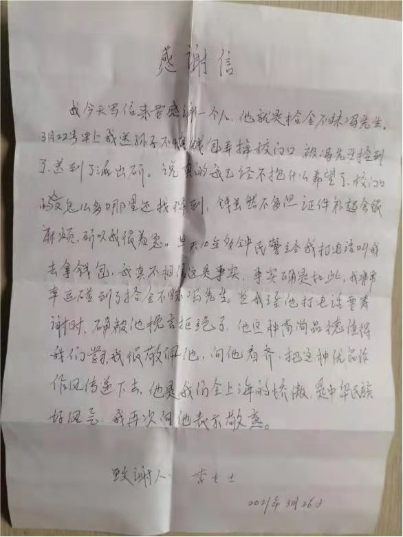 3月26日,宗保公司駐三林市容項目收到市民李女士送來(lái)的感謝信,贊揚馮四軍和杜祖峰拾金不昧的行為。