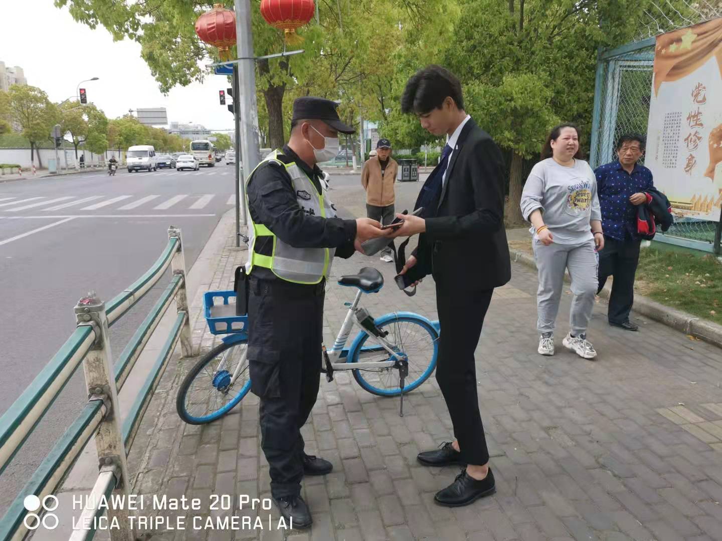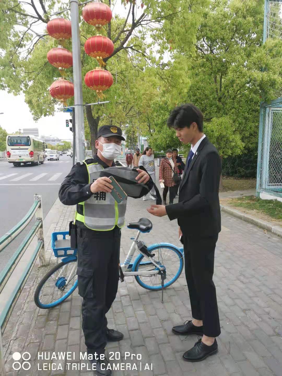 當天12:10, 徐建在沈梅東路163號社區衛生服務(wù)中心值勤時(shí),發(fā)現在路口的共享單車(chē)車(chē)筐里有一個(gè)斜挎包無(wú)人認領(lǐng),包內有一部新手機、充電器和耳機等物品。因擔心斜挎包被非失主拿走,在無(wú)法聯(lián)系失主、又考慮到失主可能會(huì )回來(lái)尋找的情況下,徐建便在原地等待。