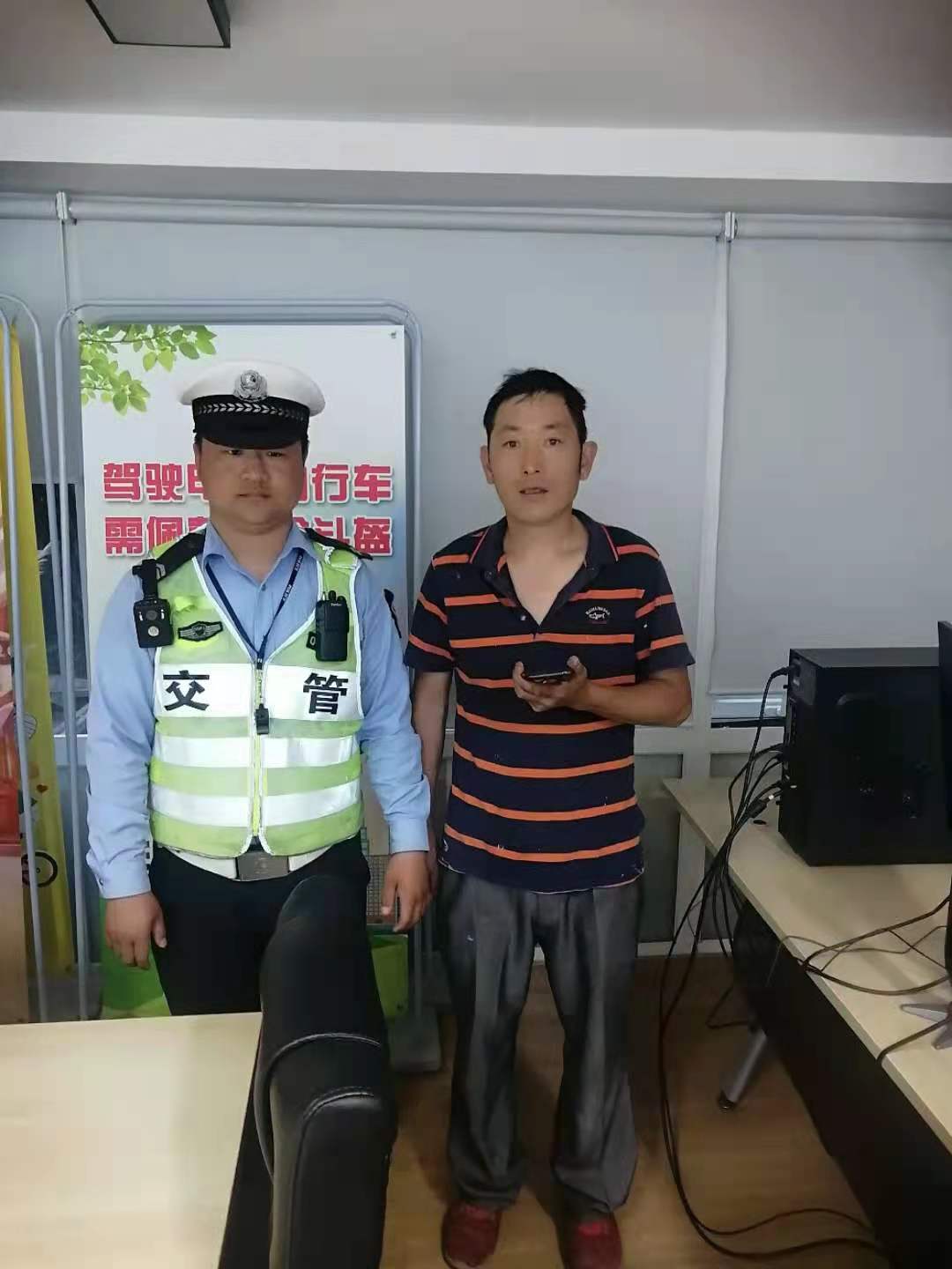 不一會(huì )兒,一個(gè)男子匆匆趕到交通崗亭,經(jīng)過(guò)仔細核對,確認該男子是失主后,馮焱便將手機歸還給他。失主再三向馮焱表示感謝!