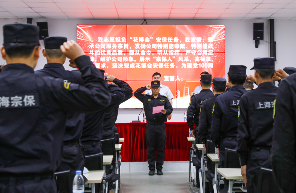 會(huì )上,副總經(jīng)理侯留勇對公司參與第十屆花博會(huì )安保人員進(jìn)行動(dòng)員,組織大家認真學(xué)習第十屆中國花卉博覽會(huì )執行委員會(huì )的相關(guān)工作部署,要求全體參與花博會(huì )安保人員胸懷大局、不辱使命,服從命令、聽(tīng)從指揮,齊心協(xié)力、全力以赴,堅決完成好花博會(huì )執委會(huì )賦予的各項安保工作任務(wù),展現宗保公司員工良好的精神面貌。隨后,全體隊員舉起右手,莊嚴宣誓,“我志愿擔負‘花博會(huì )’安保任務(wù),秉承公司服務(wù)宗旨......”