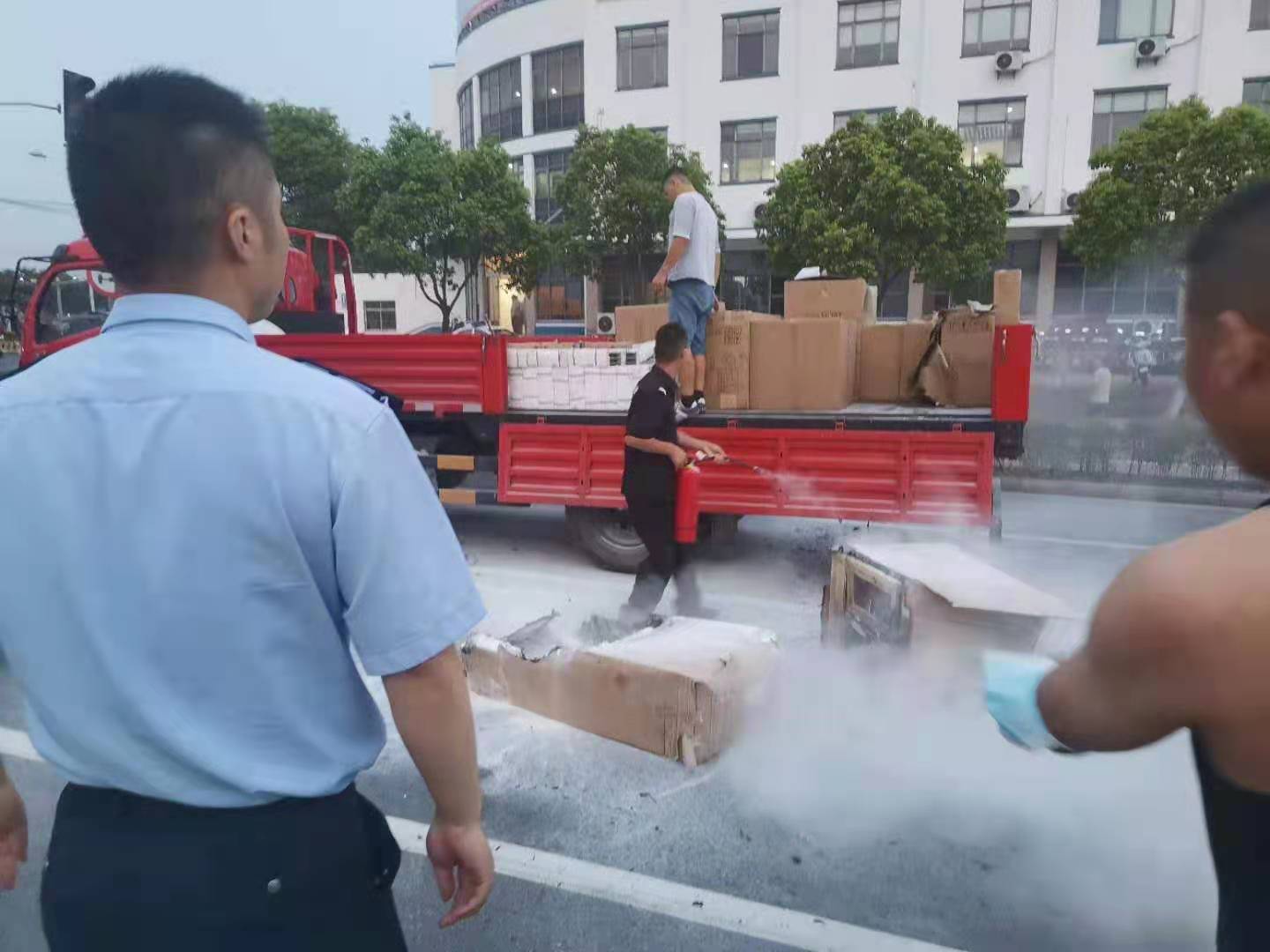 當天18:30左右,宋其波下班后在宿舍門(mén)口休息時(shí),突然發(fā)現下鹽路與申江路紅綠燈處,一輛紅色大貨車(chē)車(chē)上的貨物著(zhù)火了。