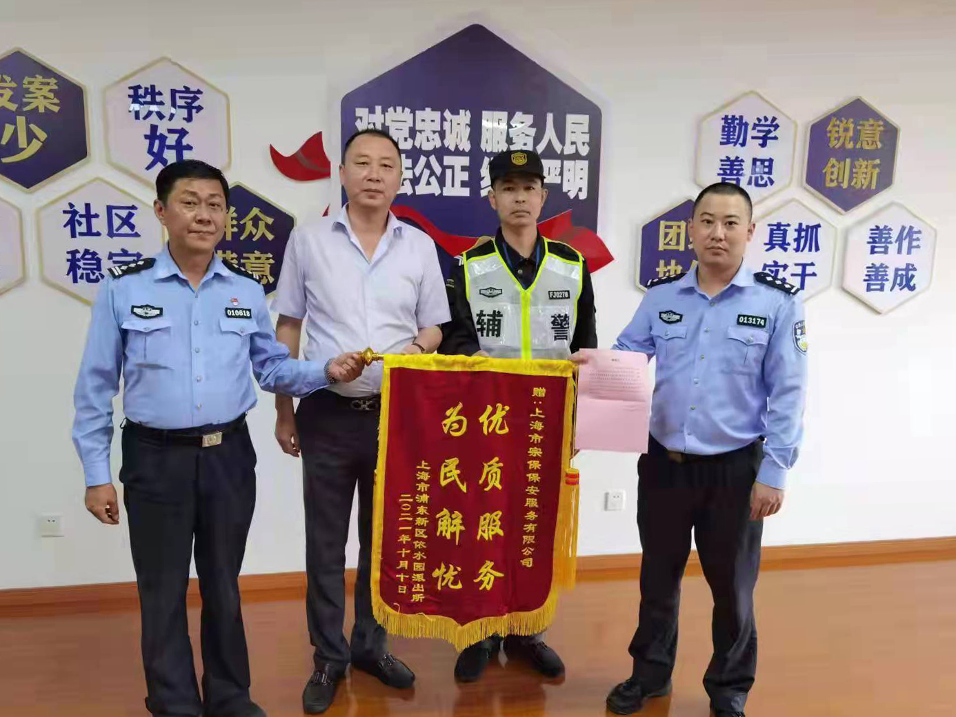 10月15日,浦東新區依水園派出所副所長(cháng)張嘯天和民警錢(qián)堅強將一面繡有“優(yōu)質(zhì)服務(wù) 為民解憂(yōu)”的錦旗和一封感謝信,送到宗保公司副總經(jīng)理王耀和隊員李軍的手上,表?yè)P宗保隊員李軍在抓獲犯罪嫌疑人中機智果敢的行為。
