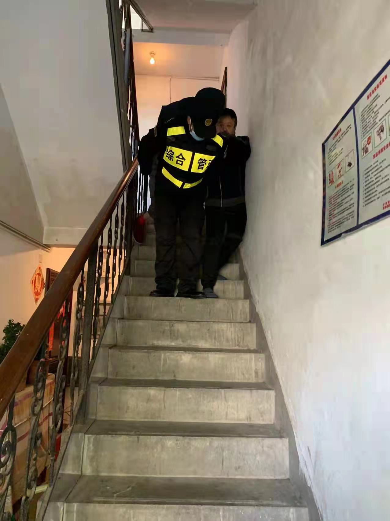 11月26日,宗保公司駐滬東市容項目隊員幫忙背老人下樓就醫。