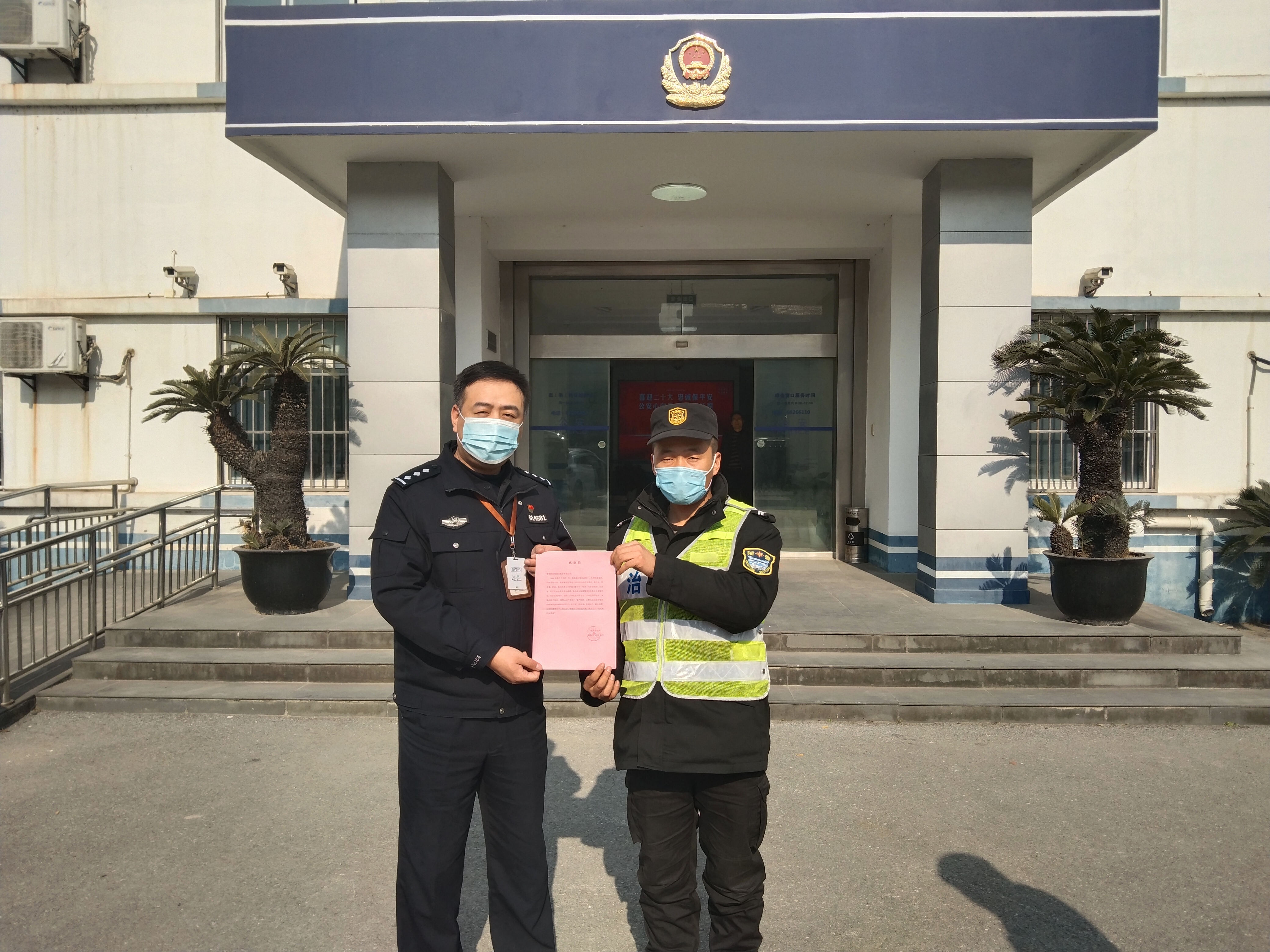 12月28日,浦東新區依水園派出所所長(cháng)施引軍和民警錢(qián)堅強向公司副總經(jīng)理王耀和項目負責人宮建華贈送繡有“專(zhuān)業(yè)務(wù)實(shí) 熱情敬業(yè)”的錦旗和表?yè)P信,表?yè)P項目特保隊員愛(ài)崗敬業(yè)、履職盡責的優(yōu)良表現。