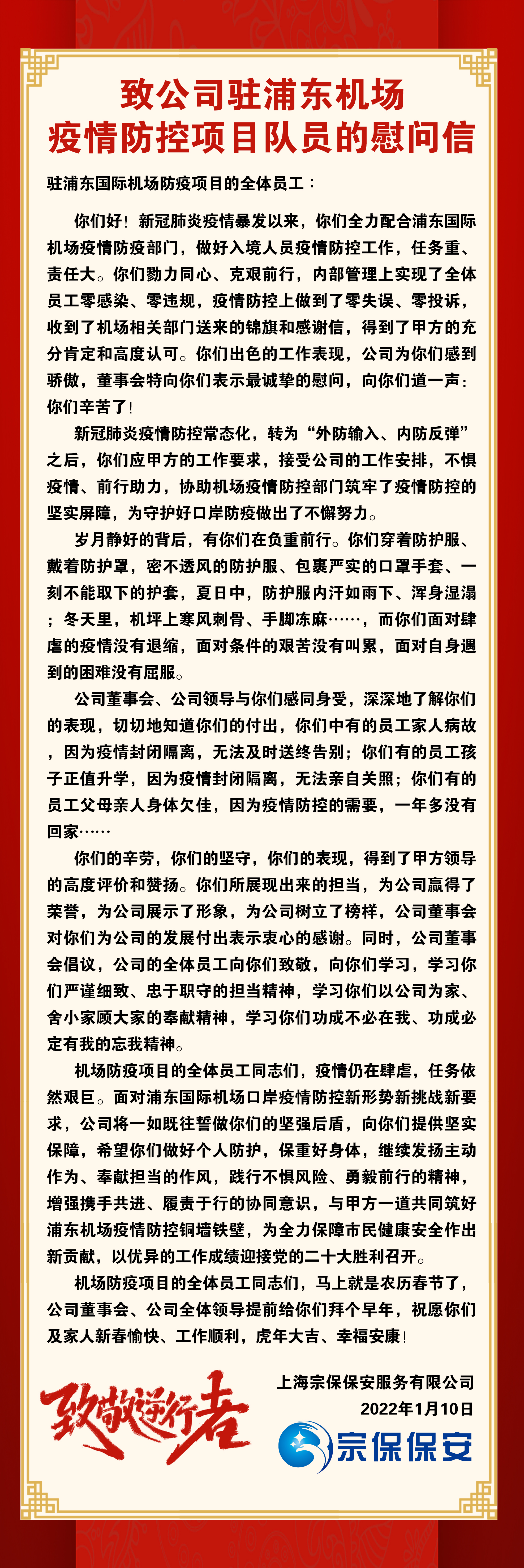 致宗保機場(chǎng)防疫隊員的一封信