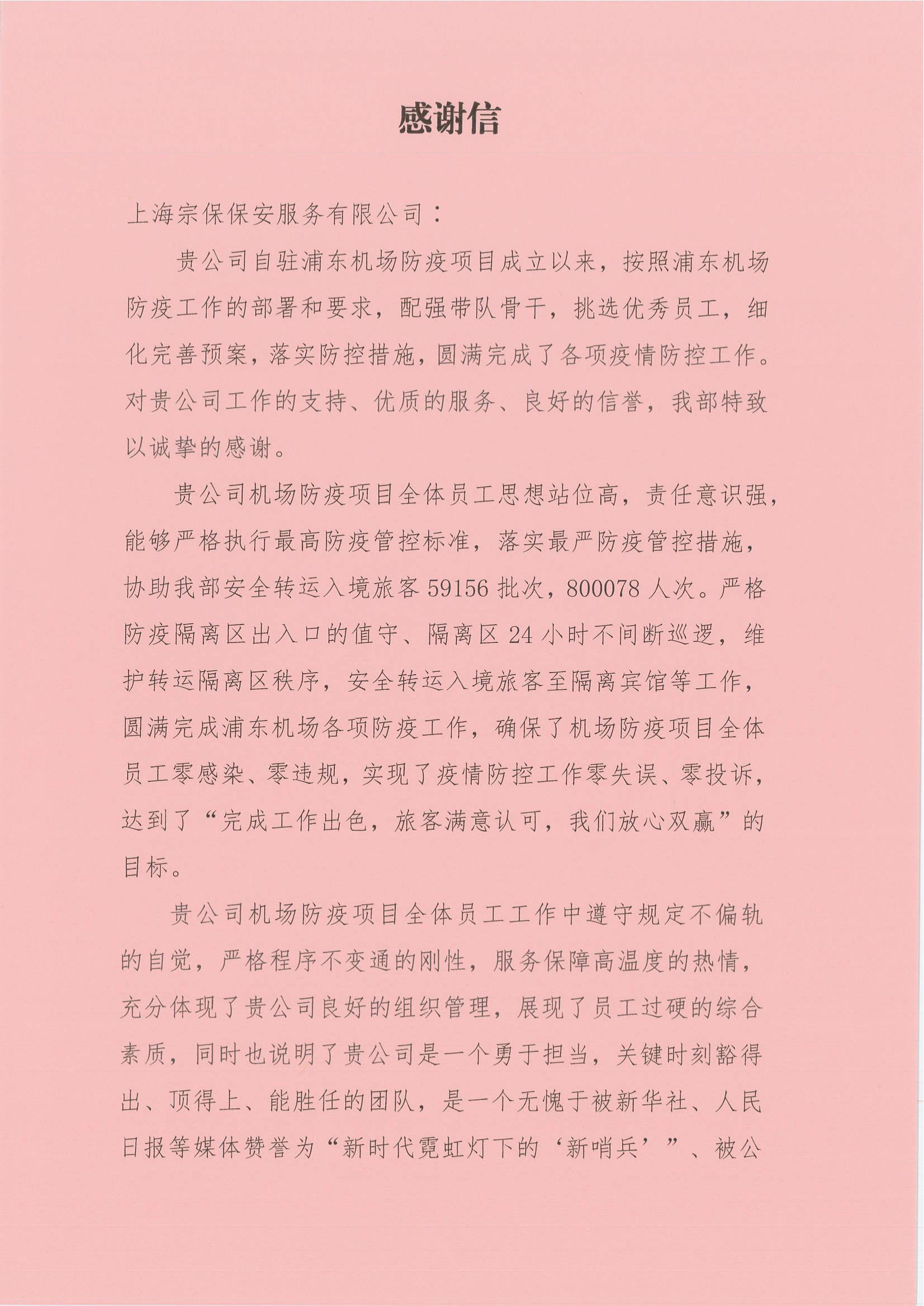 機場(chǎng)股份公司安檢護衛保障部贈送錦旗是對宗保公司駐機場(chǎng)防疫項目全體員工所做工作的肯定,不僅僅是榮譽(yù)和鼓勵,更是鞭策和責任。公司將繼續發(fā)揚主動(dòng)作為、奉獻擔當的作風(fēng),踐行不懼風(fēng)險、勇毅前行的精神,增強攜手共進(jìn)、履責于行的協(xié)同意識,與甲方一道共同筑好浦東機場(chǎng)疫情防控銅墻鐵壁,為全力保障市民健康安全作出新貢獻。