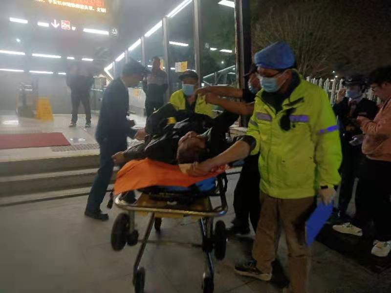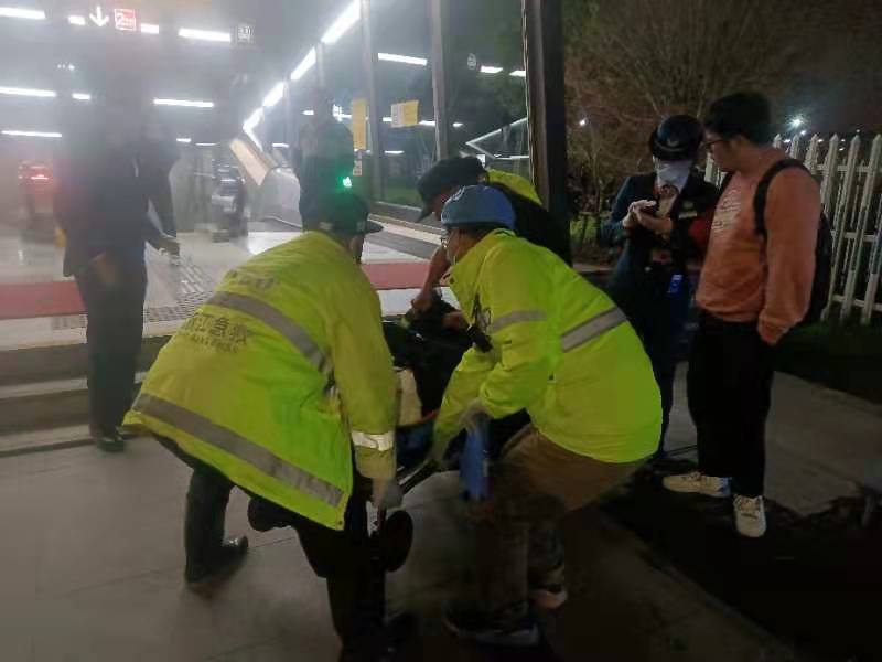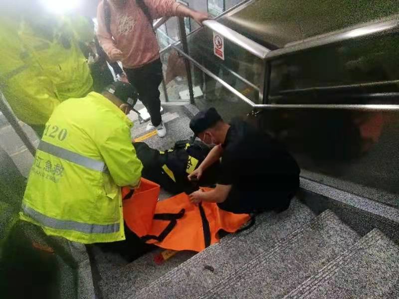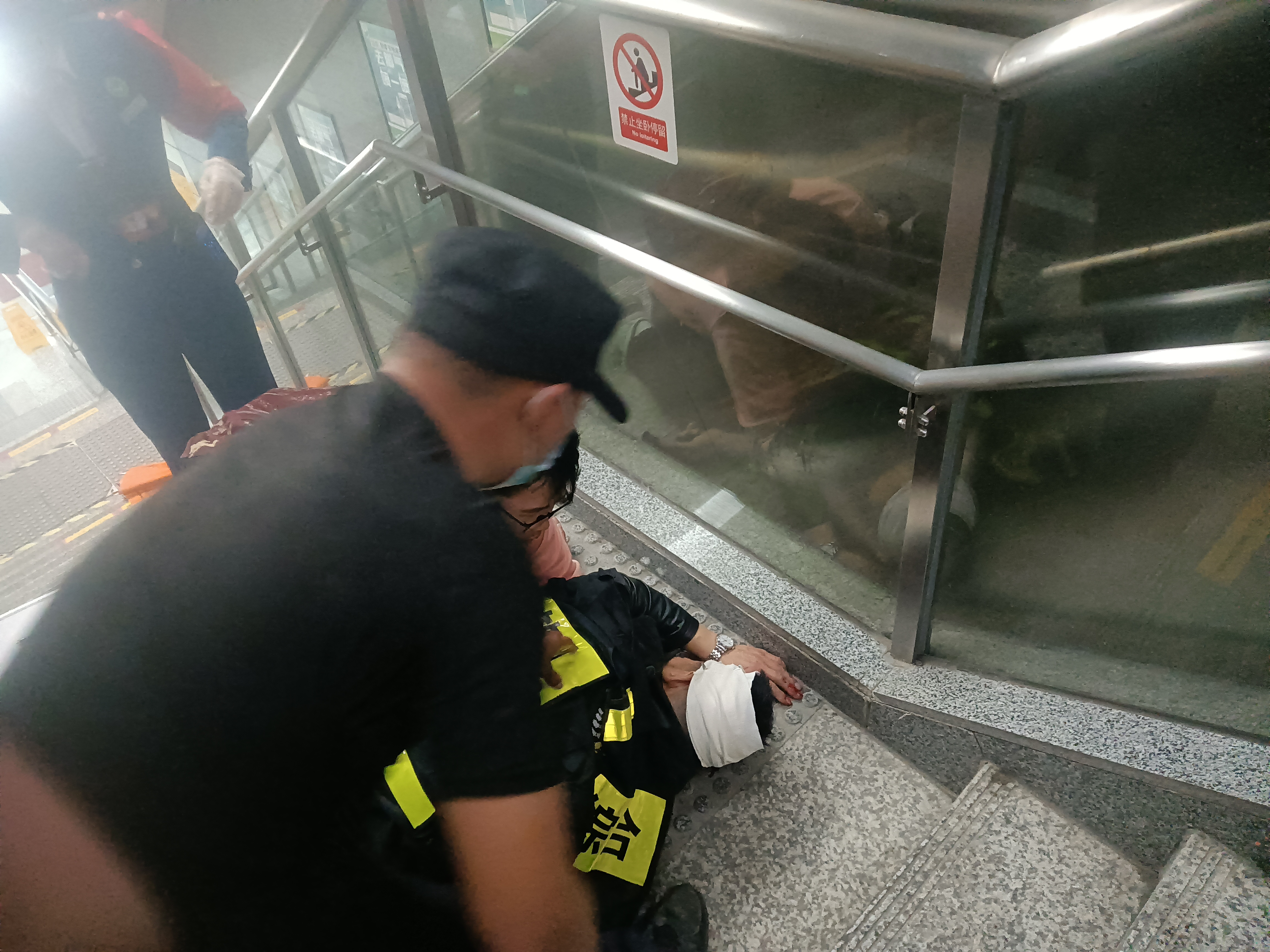 當日21:20,王艷強和鄭之元在地鐵二號線(xiàn)良渚站D出入口處巡邏時(shí),看到步梯上有一男子一動(dòng)不動(dòng)地趴在地上,頭部正在流血,旁邊站著(zhù)的一個(gè)男子顯得不知所措。