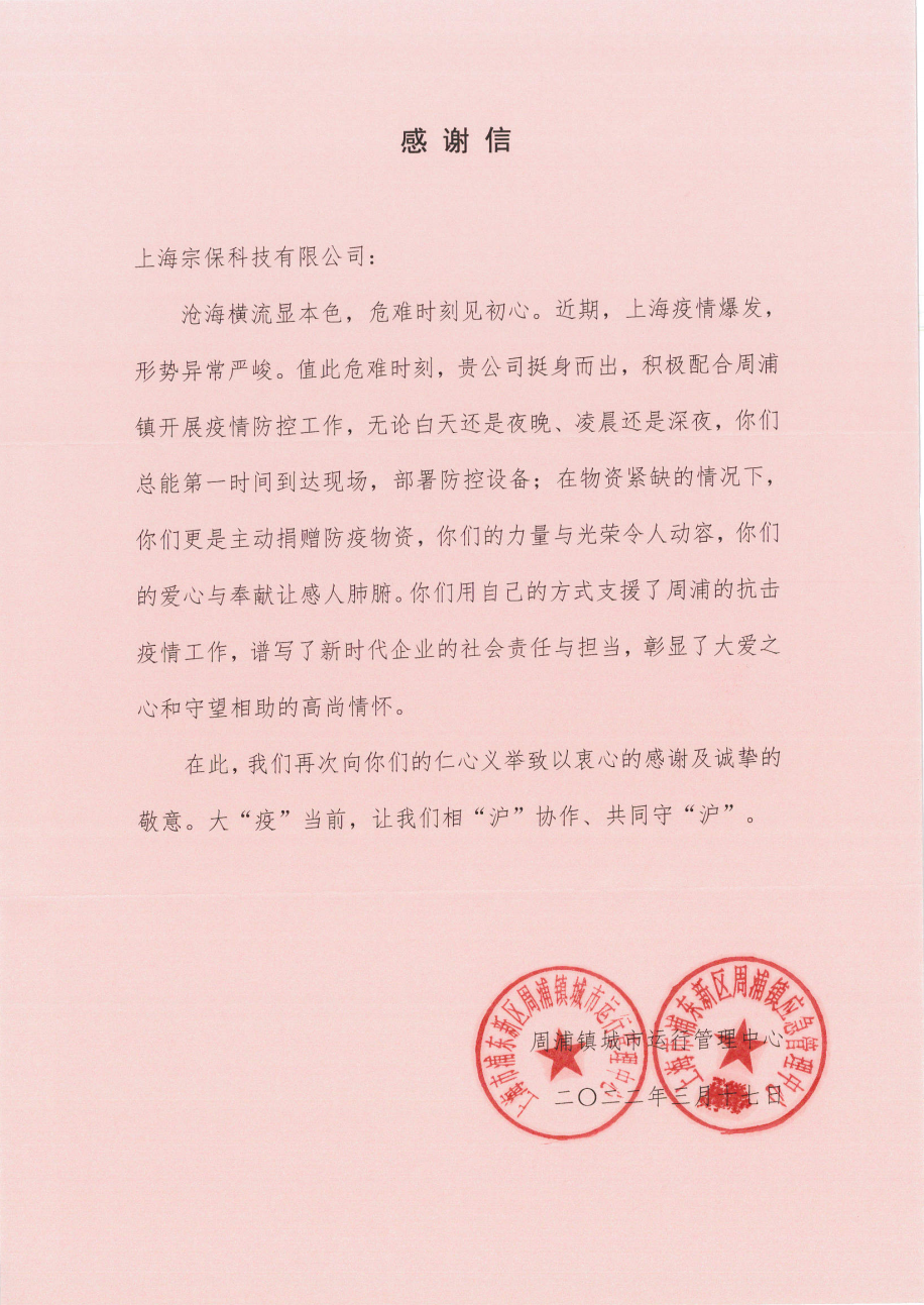 3月17日,上海宗??萍加邢薰臼盏街芷宙偝鞘羞\行管理中心和周浦鎮應急管理中心的感謝信,感謝宗??萍紝χ芷宙傄咔榉揽毓ぷ鞯拇罅χС?。