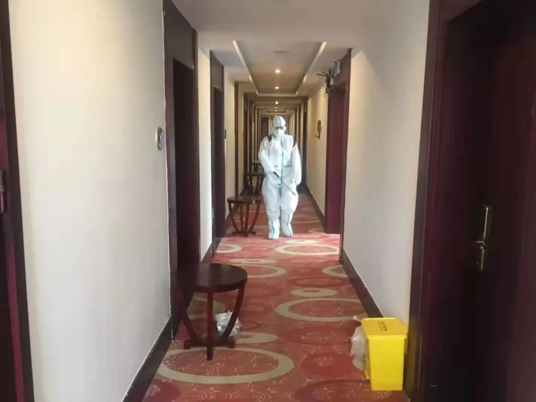 丑時(shí),隔離酒店里,宗保員工正在對酒店內的樓梯、電梯轎廂、走道等公共區域進(jìn)行消殺。