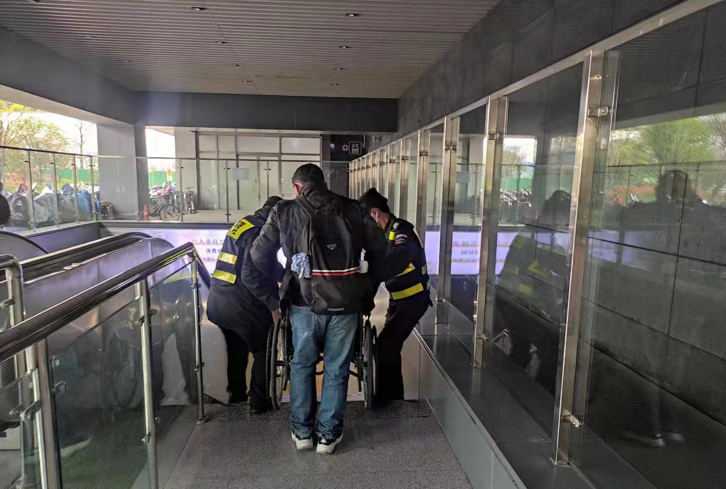 張彬洋和樊粵強主動(dòng)幫忙將老人抬下樓梯。因樓梯陡長(cháng),兩人抬起輪椅時(shí)格外小心,不敢直起腰,生怕老人從輪椅上滑下來(lái),直至將老人安全地抬下樓梯,送到了地鐵候車(chē)區域。