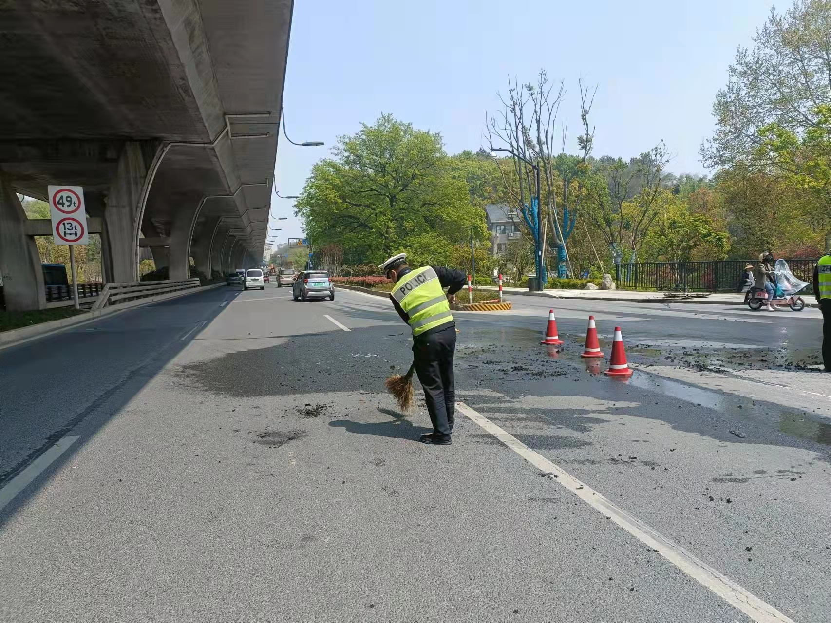 當幾個(gè)人趕到高架橋下時(shí),發(fā)現高速隔離板處有明火在燃燒,玻璃碎渣不時(shí)掉落下來(lái),橋下情況十分危險。見(jiàn)此情形,馮奧立即將情況上報工作站值班領(lǐng)導,協(xié)助引導路面車(chē)輛避開(kāi)繞行,安排同事封閉右轉專(zhuān)用車(chē)道,避免過(guò)往車(chē)輛和行人受到傷害。