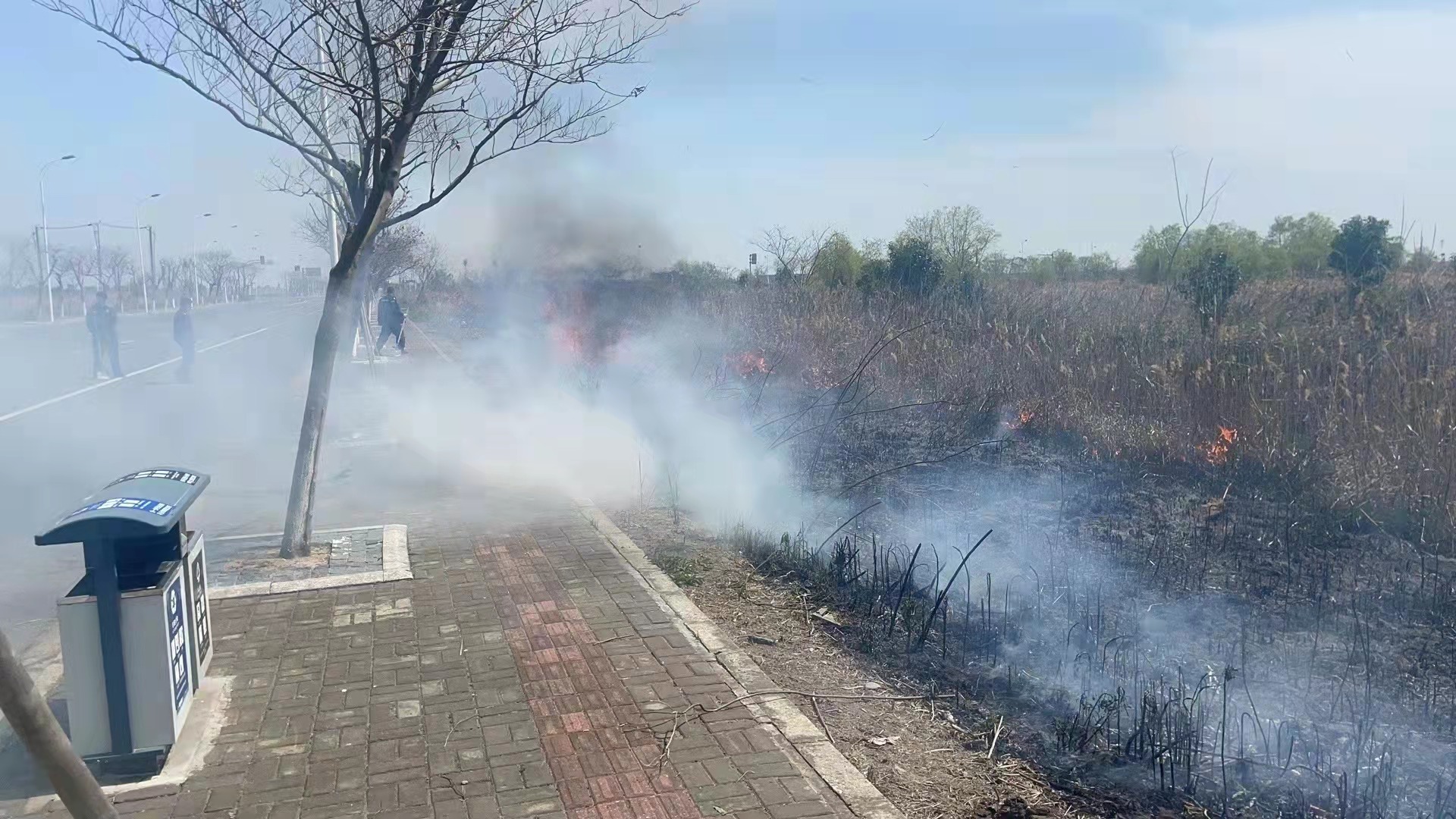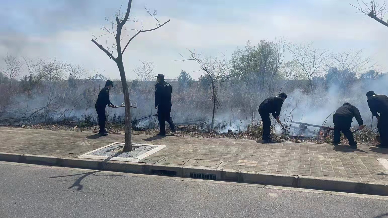 當日12:30,趙鵬和幾位隊員在環(huán)湖一路附近巡邏時(shí),看到不遠處的空地上有黑煙冒起,隨即開(kāi)著(zhù)巡邏車(chē)前往查看,發(fā)現路邊雜草起火。