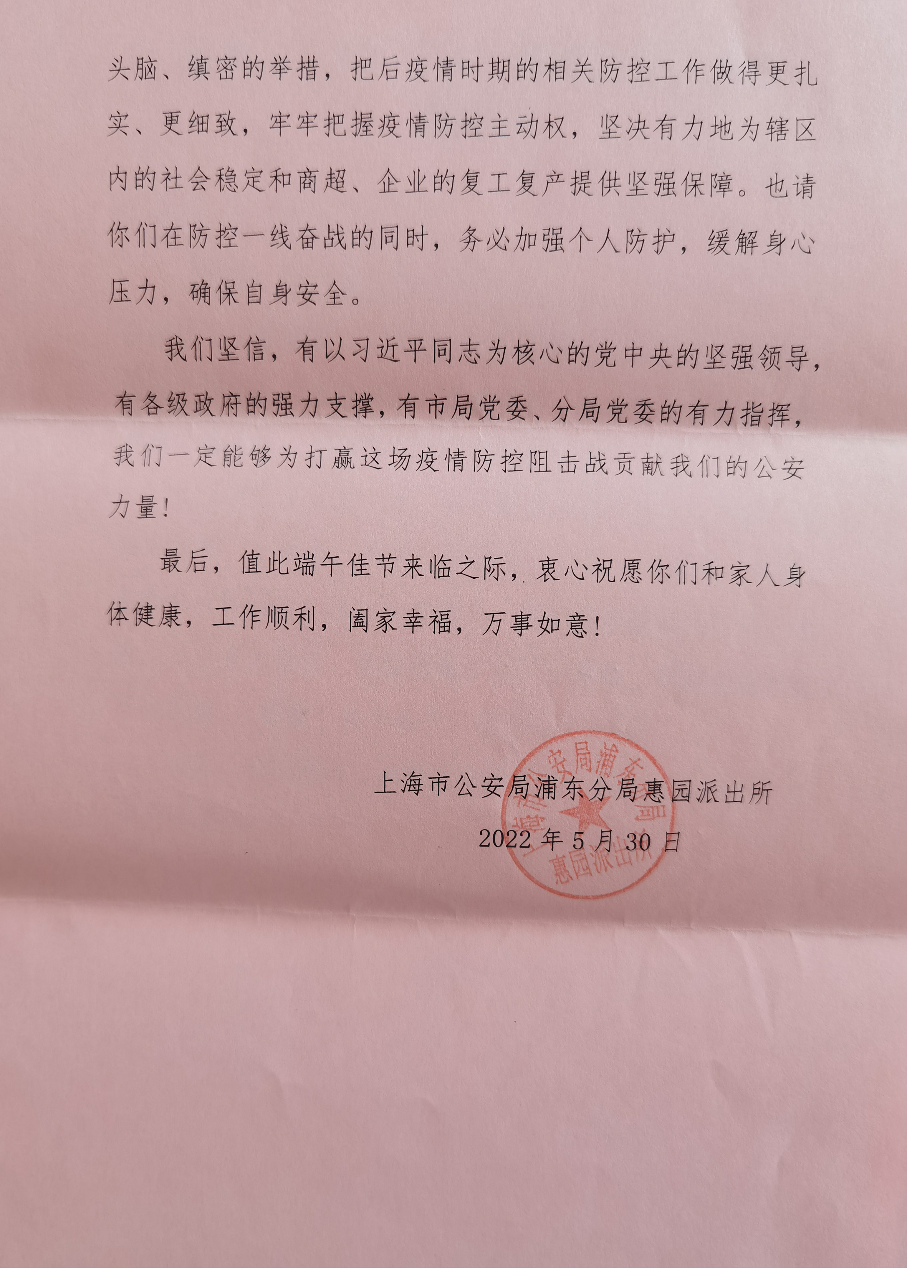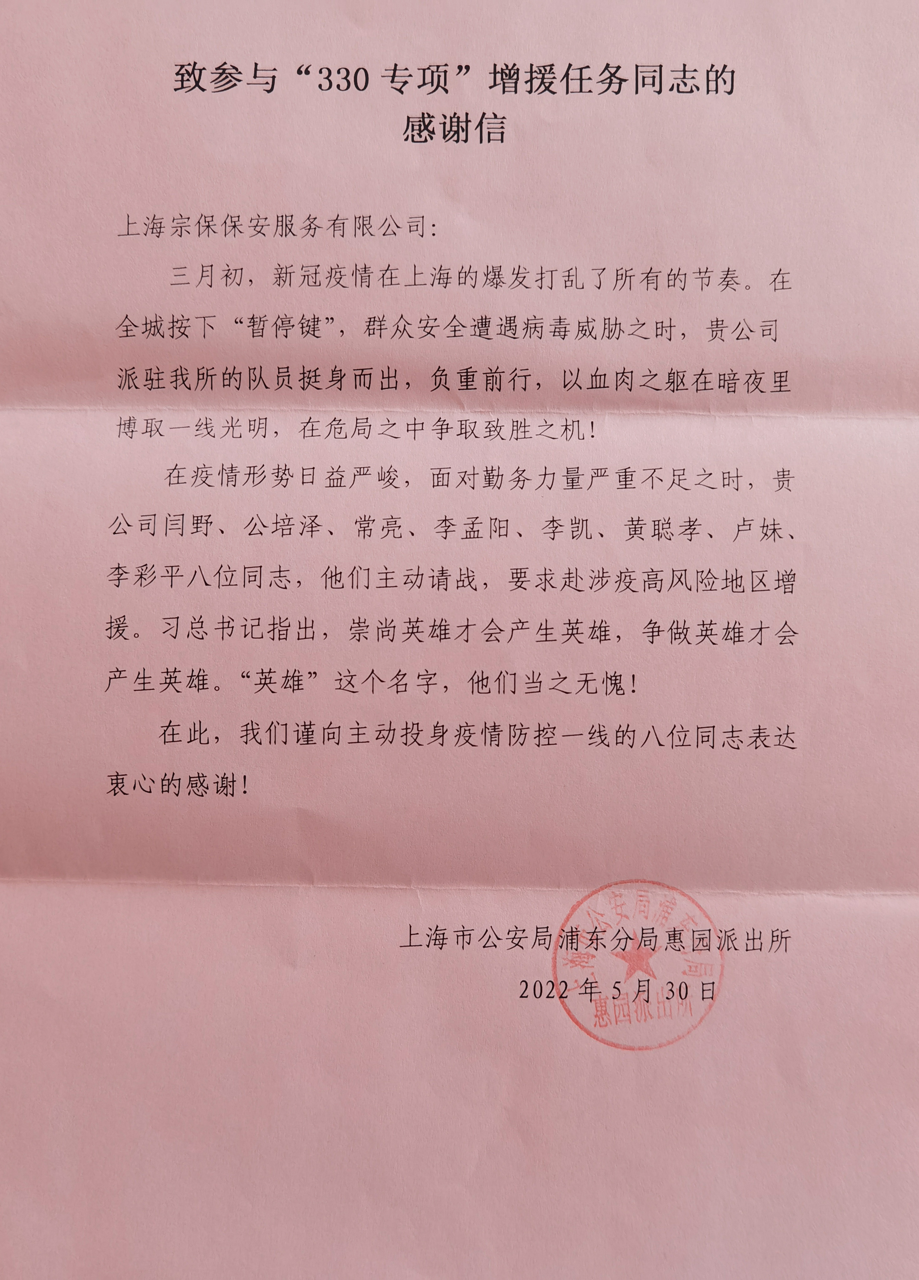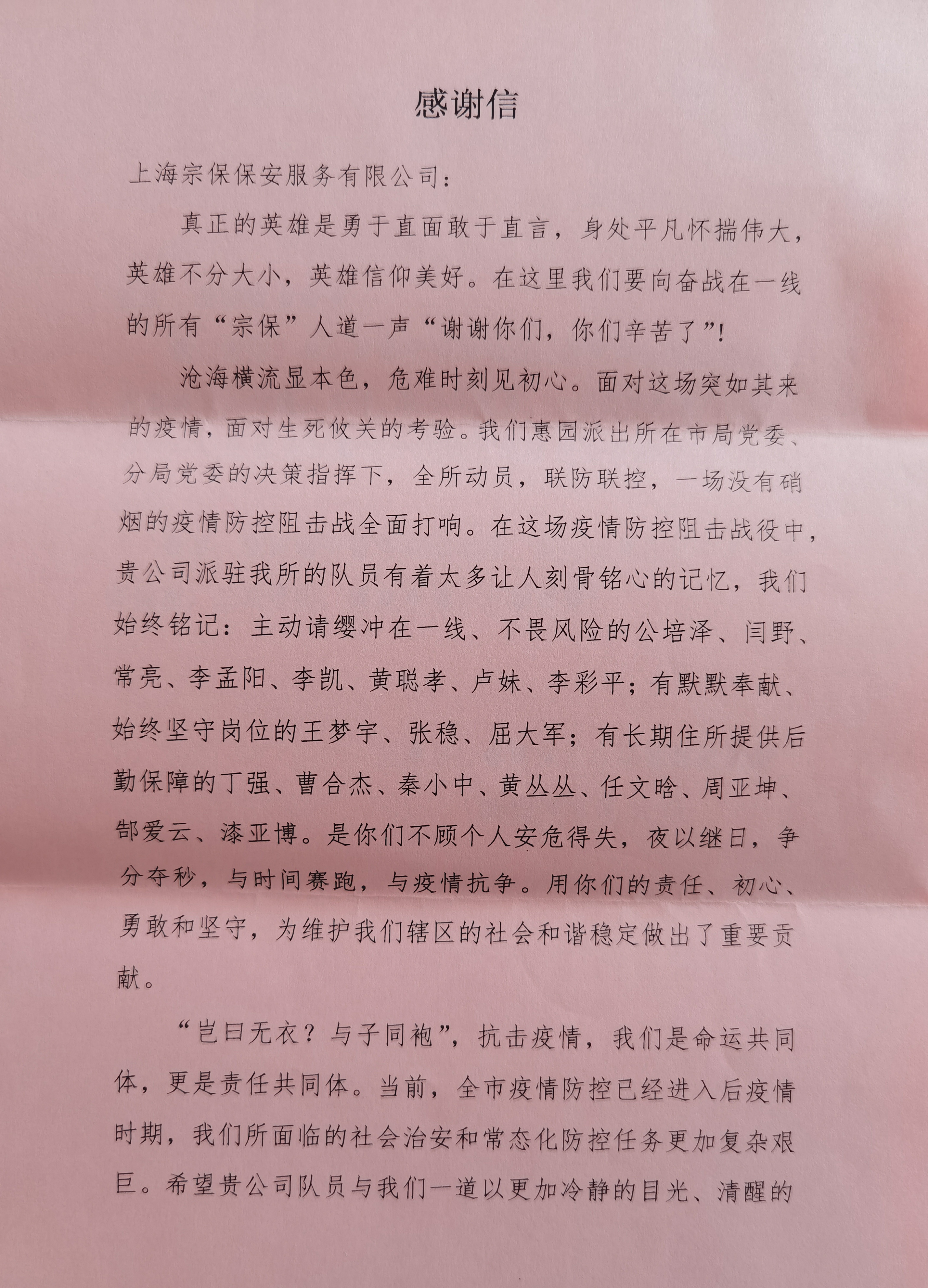 5月30日,宗保公司收到浦東公安分局惠園派出所的感謝信,衷心感謝宗保公司在疫情防控關(guān)鍵時(shí)期對其工作的大力支持。