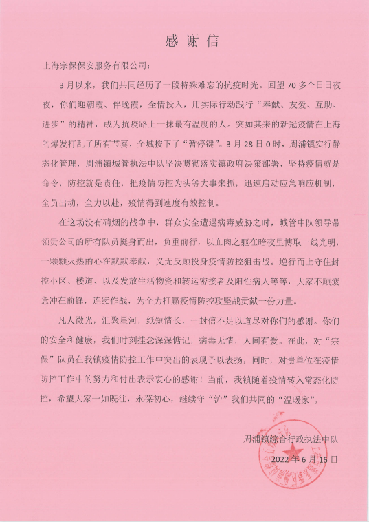 6月16日,宗保公司收到浦東公安分局周浦派出所的感謝信,信中對公司員工在疫情防控期間的辛勤付出和無(wú)私奉獻給予充分肯定,并表示衷心感謝。