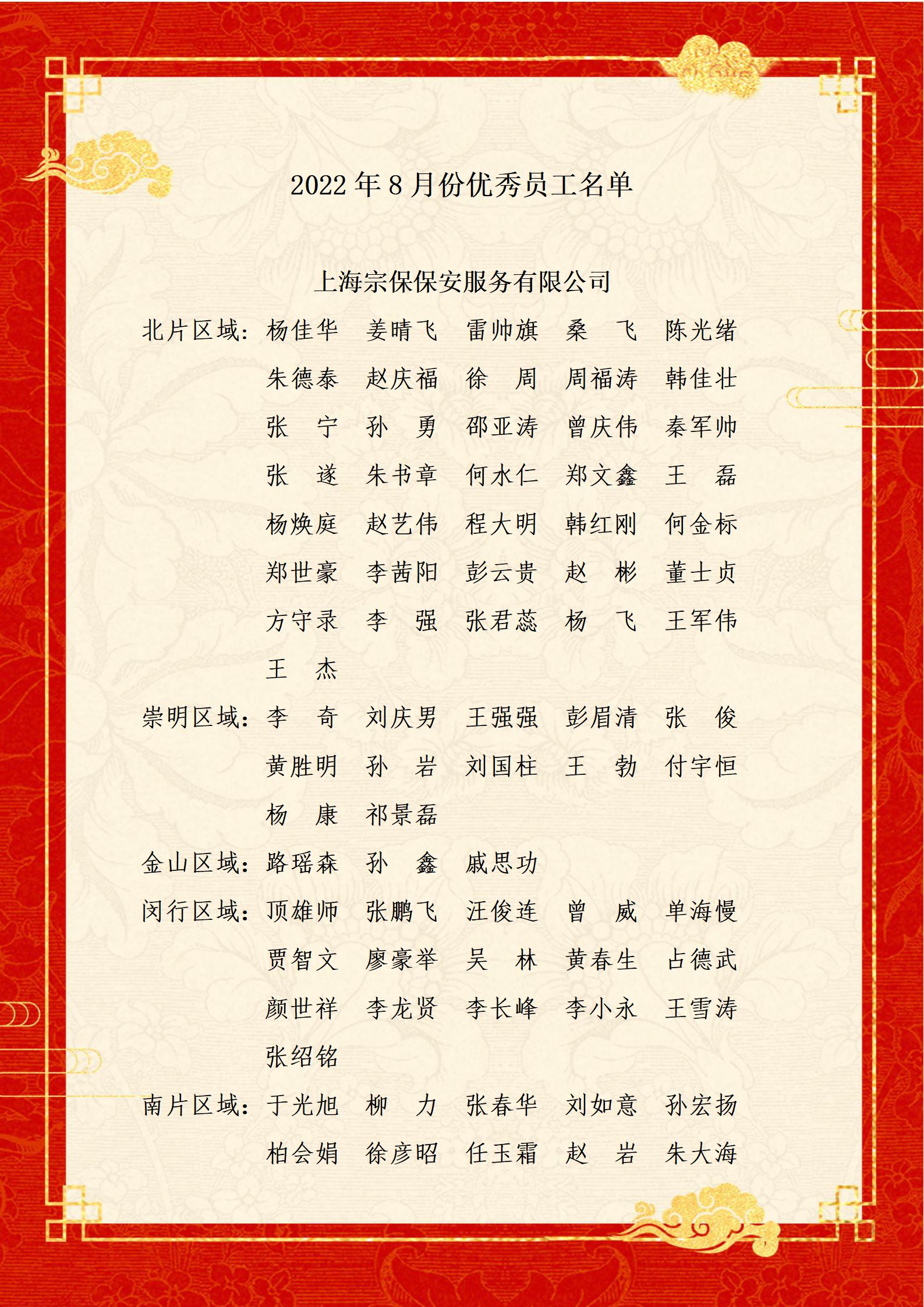 8月份,公司廣大員工根據甲方的任務(wù)部署,按照公司的工作要求,不懼風(fēng)險、勇毅前行,頂著(zhù)高溫、冒著(zhù)酷暑,協(xié)助完成重點(diǎn)項目開(kāi)工儀式、重要商業(yè)開(kāi)業(yè)儀式、夏日海堤安全巡查等保障任務(wù),全力配合持續做好疫情防控,輔助做好城市管理、治安聯(lián)防、街面巡邏等工作。期間,涌現出了一批盡心履責、崗位建功、拾金不昧、助人為樂(lè )的優(yōu)秀員工和先進(jìn)典型。