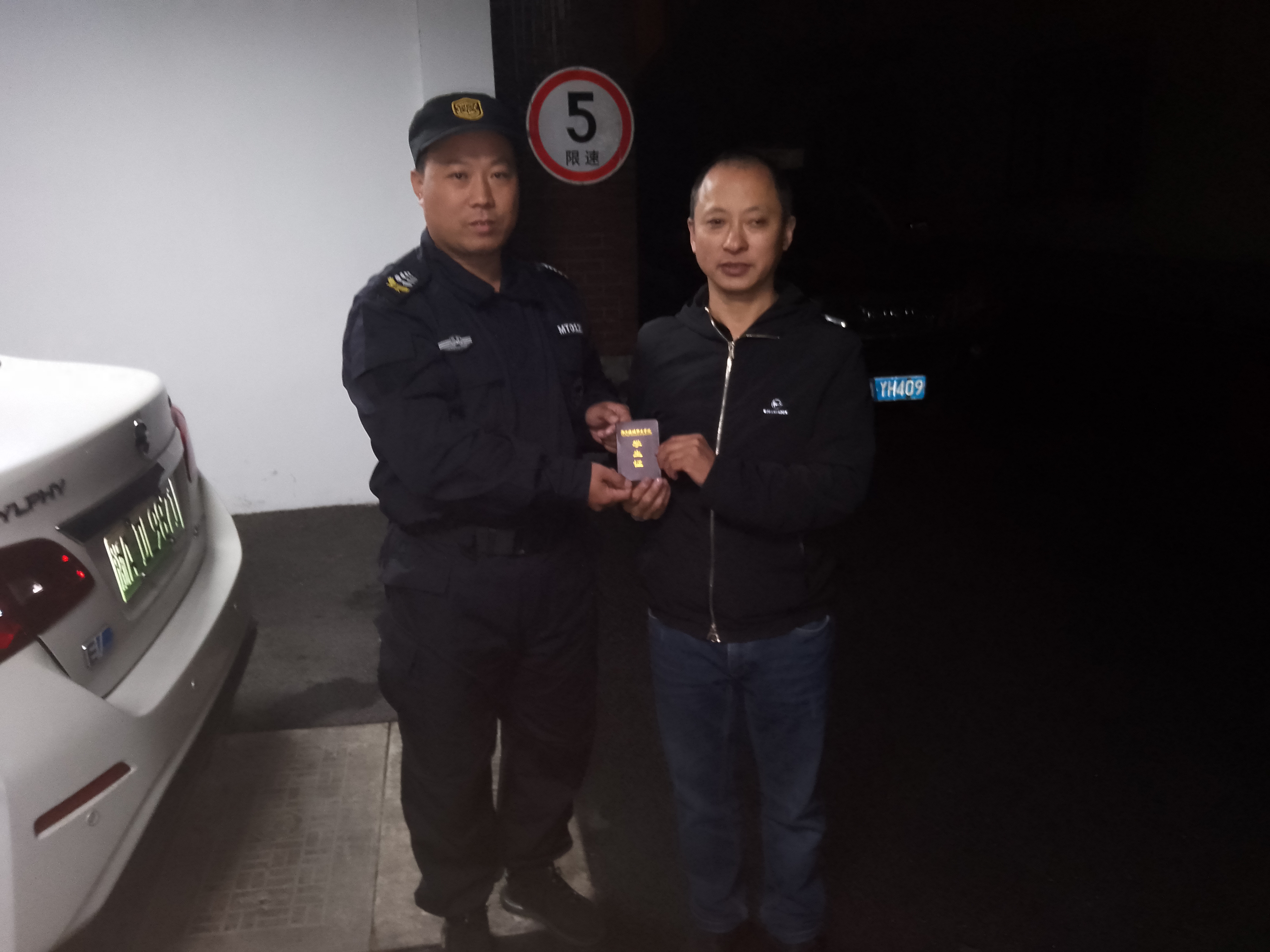 陳娣按照項目負責人的指示,留在原地邊值勤邊等候,時(shí)時(shí)留意著(zhù)是否有人來(lái)尋找物品。半個(gè)多小時(shí)過(guò)去了,仍未有失主過(guò)來(lái)尋找,陳娣便撥打了轄區派出所值班電話(huà)求助。隨后,在 派出所民警的幫助下,通過(guò)查詢(xún)身份證信息聯(lián)系到了失主,并約好了見(jiàn)面的時(shí)間和地點(diǎn)。