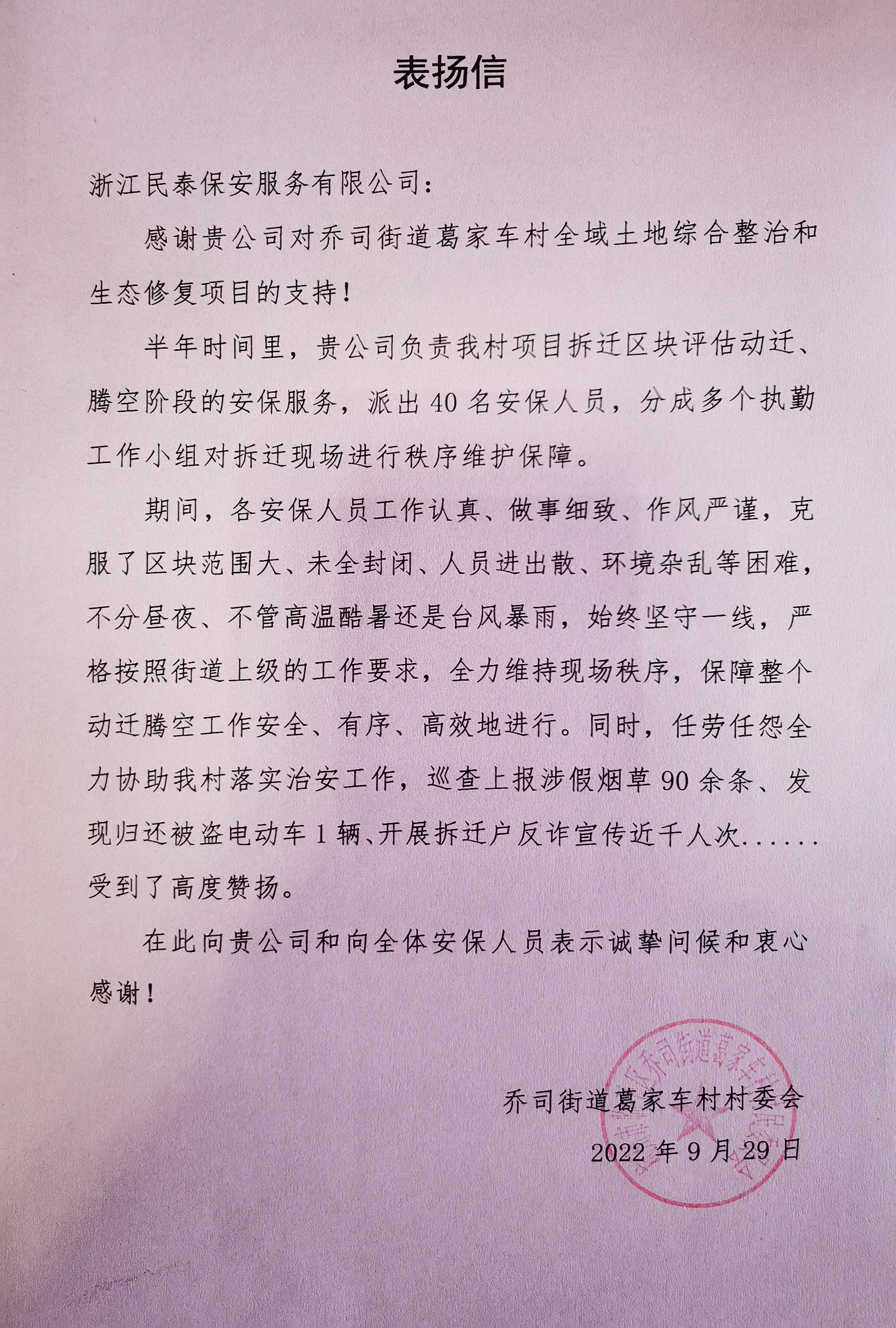 9月29日,浙江民泰公司駐杭州市臨平區喬司街道葛家車(chē)村項目收到村委會(huì )的表?yè)P信,感謝公司對其域內土地綜合整治和生態(tài)修復項目的大力支持。