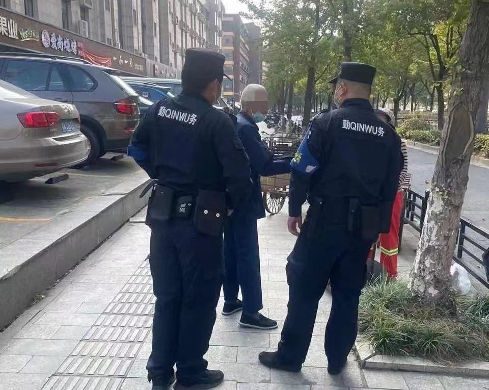原來(lái),大爺走路時(shí)不慎摔了一跤,一時(shí)站不起來(lái)。靳龍龍連忙查看大爺傷勢如何,所幸腿部只有一點(diǎn)點(diǎn)擦傷。隊員馮孝峰是良渚本地人,經(jīng)過(guò)方言一番溝通,了解到大爺姓金,今年82歲,家就住在不遠處的某小區。