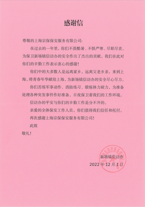 12月1日,宗保公司駐浦東新區新場(chǎng)鎮政府輔助項目收到鎮信訪(fǎng)辦送來(lái)的感謝信,信中對公司員工履職盡責的工作表現給予了充分肯定。