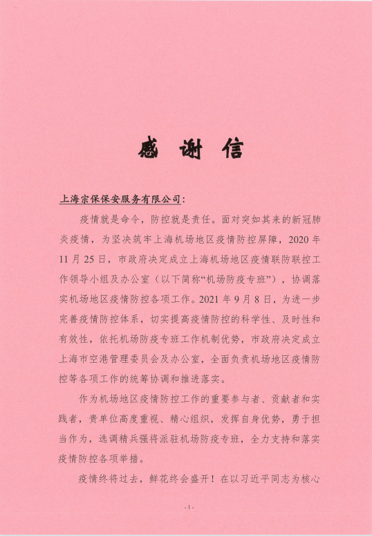 1月30日,上海市空港管理委員會(huì )辦公室送來(lái)感謝信,感謝公司疫情期間對浦東機場(chǎng)疫情防控工作的大力支持。