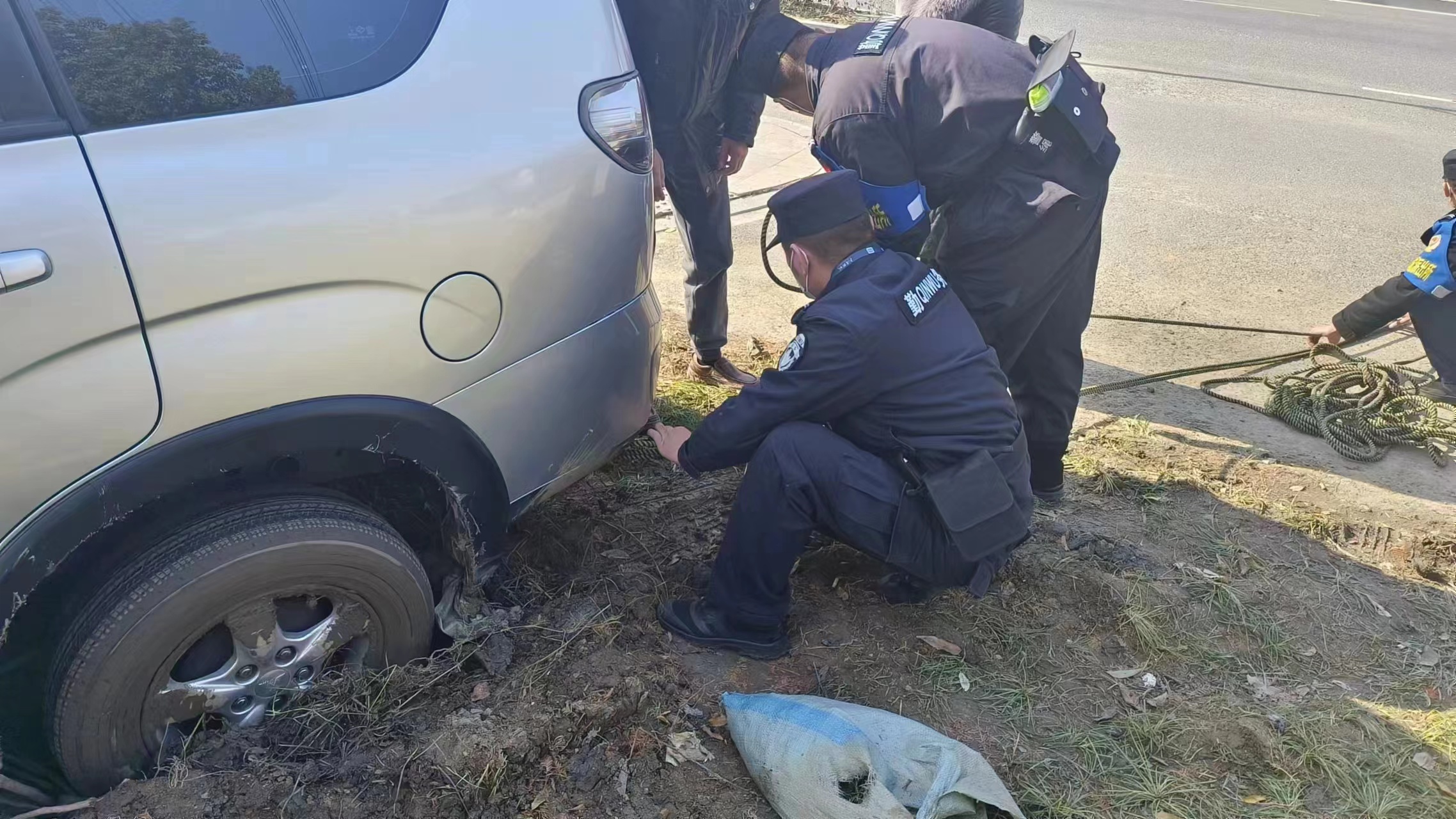 了解情況后,幾人先讓于師傅將車(chē)上的行李和年貨卸下來(lái)減輕車(chē)子負重,隨后眾人合力推車(chē),但因車(chē)子陷入泥中太深,只在原地打滑。這時(shí),劉振疆急中生智,急忙向附近駛來(lái)的貨車(chē)招手求助,借來(lái)拖車(chē)繩,車(chē)尾巡邏警車(chē)拉,車(chē)頭眾人合力推,終于將車(chē)子拖到了馬路上。