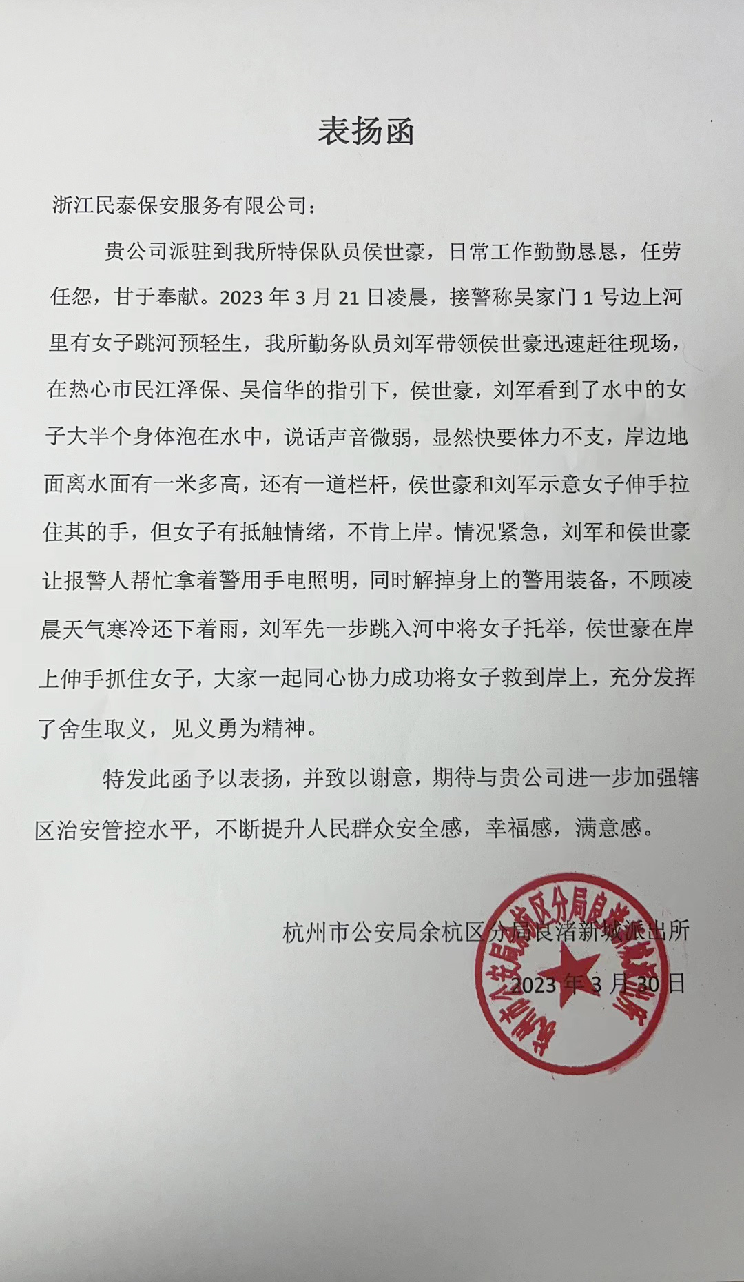 3月21日,浙江民泰公司駐杭州市余杭區良渚新城派出所輔助項目員工合力施救跳河輕生女子,甲方特致函給予表?yè)P。