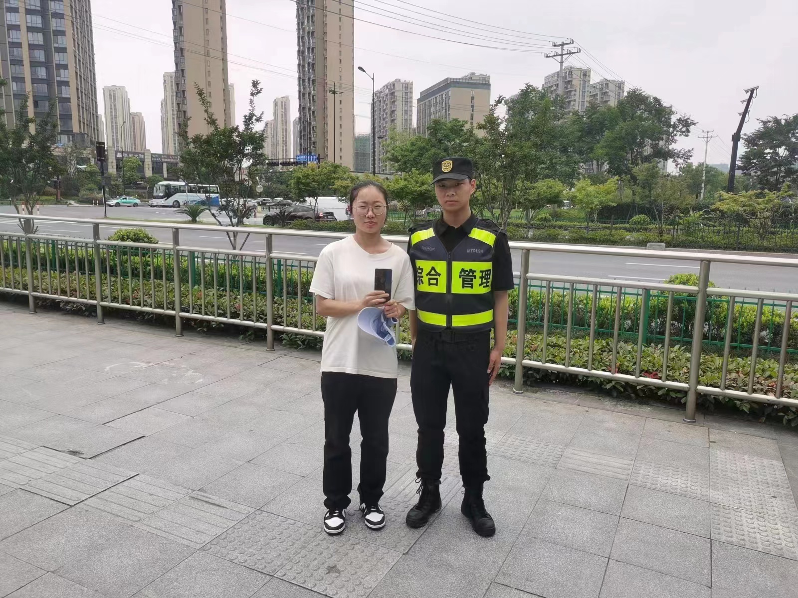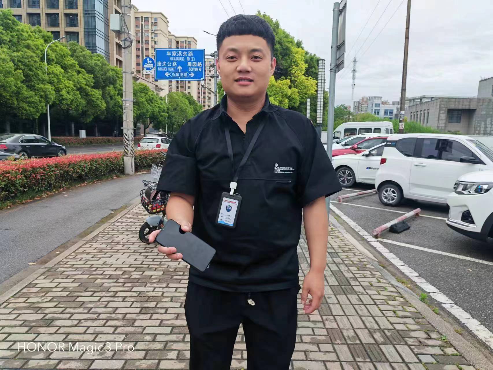 當日6:20,公司員工陳鎮在昌運里儲運路值勤時(shí),撿到一部黑色華為P40手機,詢(xún)問(wèn)周?chē)藛T無(wú)人認領(lǐng)后,便將情況報告了項目負責人,并按指示邊值勤邊留意尋找物品的人。