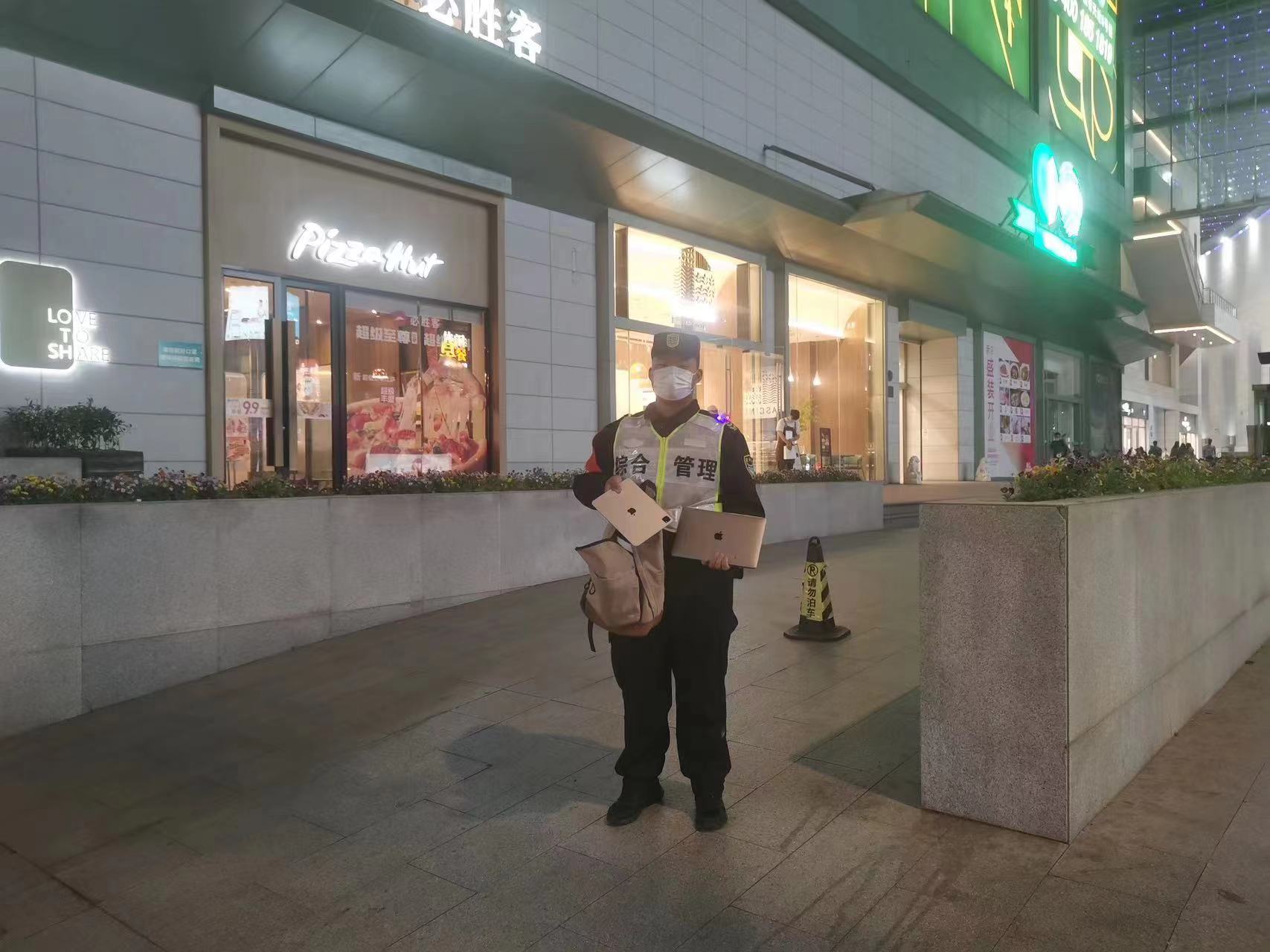當日19:20,公司員工楚世超在浦東南路八佰伴西廣場(chǎng)出入口值勤時(shí),撿到一個(gè)深米色背包,內有一個(gè)蘋(píng)果牌平板電腦、一臺蘋(píng)果牌筆記本電腦和若干辦公資料。