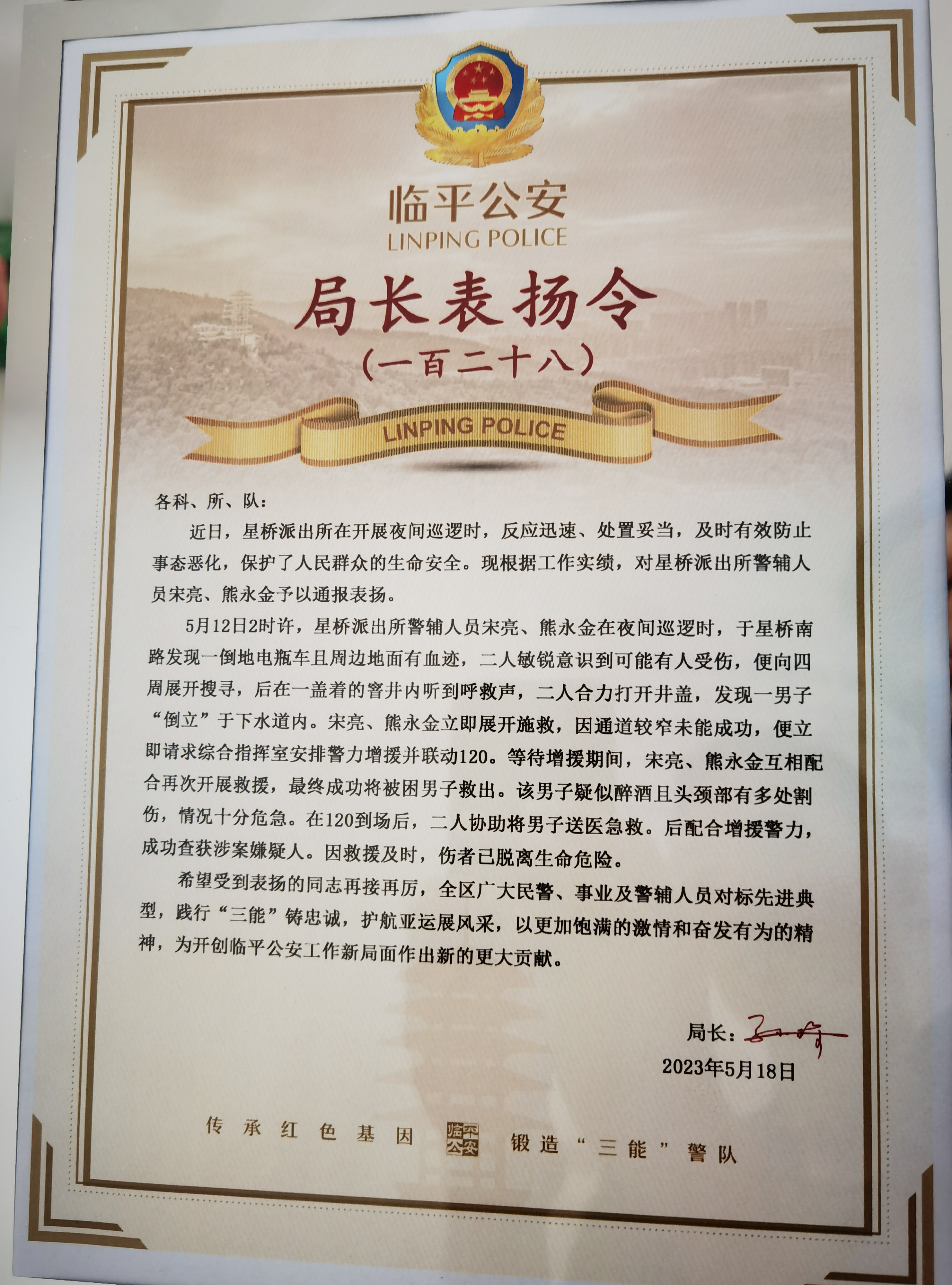 6月2日,浙江民泰公司駐杭州市臨平區星橋派出所輔助項目收到由臨平區公安分局孫琦局長(cháng)簽發(fā)的128號《局長(cháng)表?yè)P令》,對公司員工宋亮機警認真、沉著(zhù)冷靜,妥善處置突發(fā)事件的優(yōu)異表現給予表?yè)P。