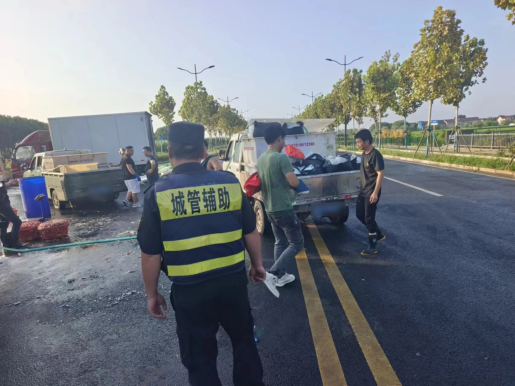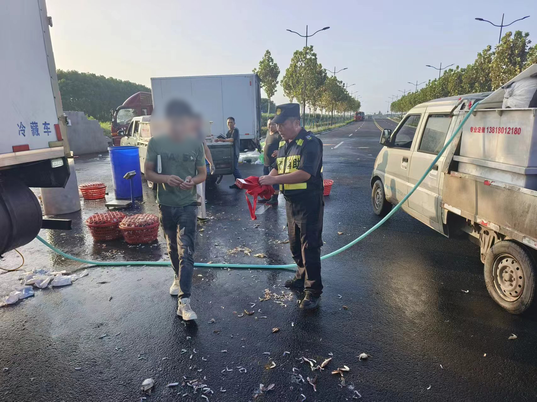 當天6:40,宗保公司員工鄭彥兵在東明路巡查時(shí),發(fā)現有幾個(gè)商販違規占道設攤賣(mài)魚(yú)蝦,便立即上前向他們講明有關(guān)市容管理規定,勸導他們違規占道設攤不僅影響市容,還妨礙行人正常通行,容易造成安全責任事故。
