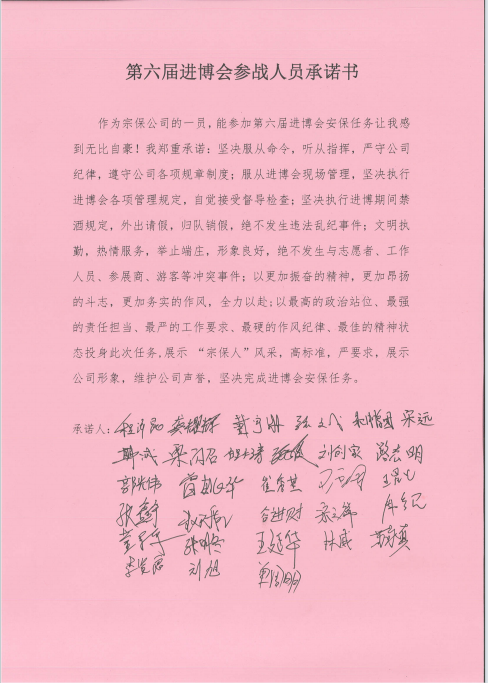 接著(zhù),公司員工栗閃召代表全體參與進(jìn)博安保員工表決心。隨后,全體參與進(jìn)博安保的員工舉起右手,在帶隊骨干程澤昆的領(lǐng)誓下宣誓:我志愿參加第六屆進(jìn)博會(huì ),服從命令,聽(tīng)從指揮,嚴守公司紀律,遵守公司各項規章制度;服從進(jìn)博會(huì )現場(chǎng)管理......,展示 “宗保人”風(fēng)采,高標準,嚴要求,展示公司形象,維護公司聲譽(yù),堅決完成進(jìn)博會(huì )安保任務(wù)。