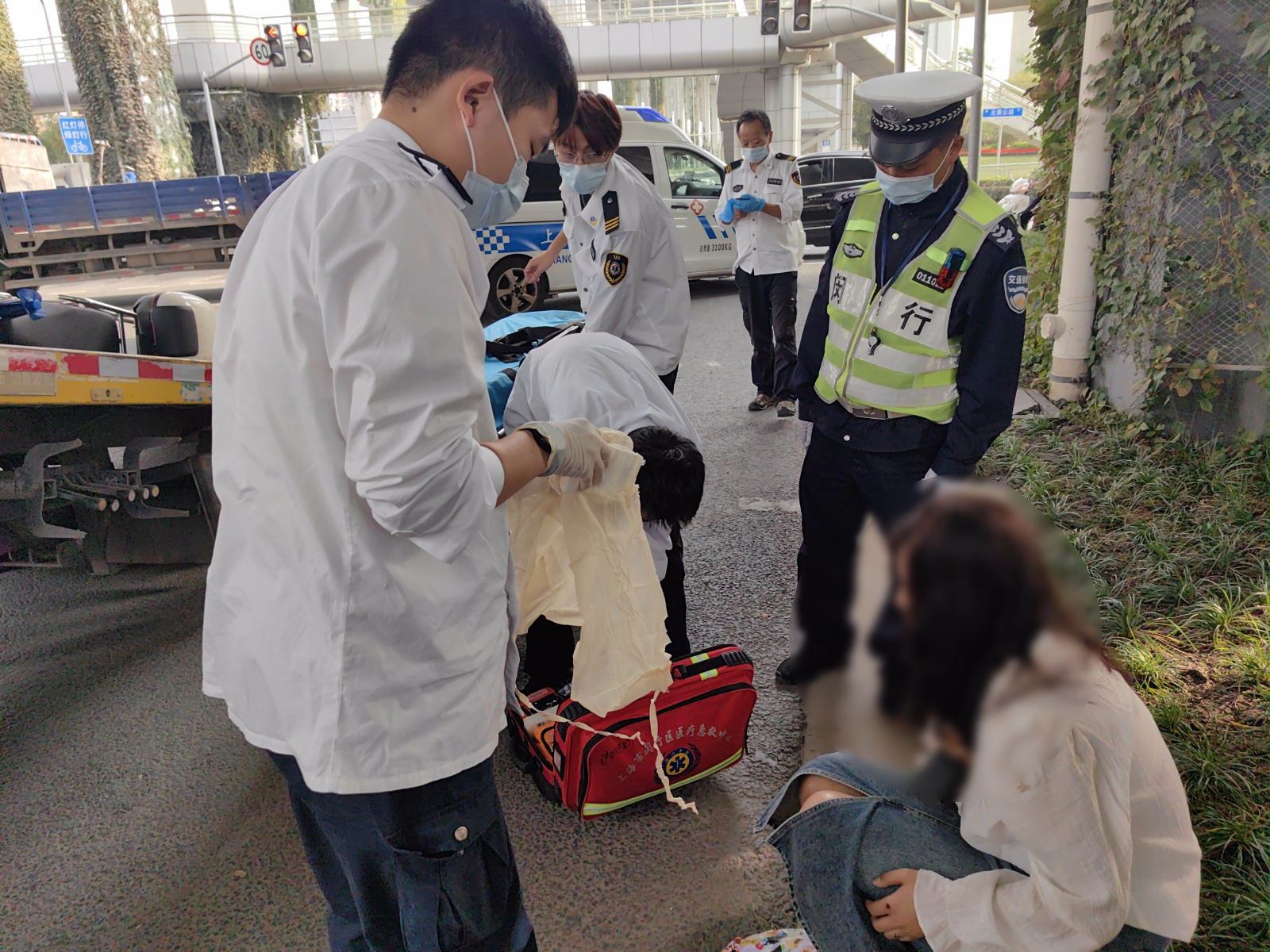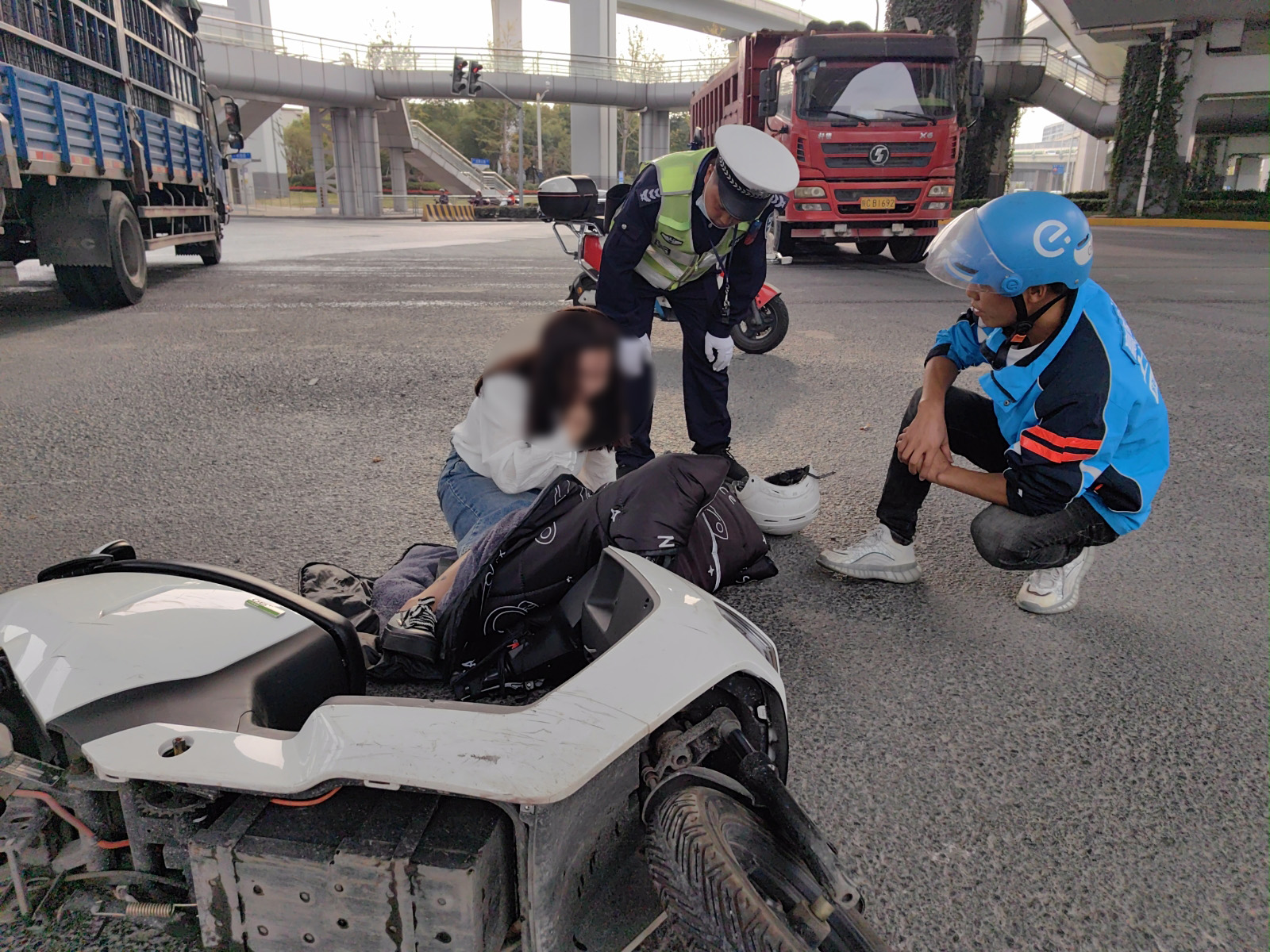 兩名員工見(jiàn)狀趕緊跑過(guò)去察看,一位女駕駛員的頭摔貼在地面上左側眉骨處有血液流出,趴著(zhù)不能動(dòng)彈,傷勢似乎很?chē)乐?,王團結立即撥打了120急救電話(huà)和交警隊指揮室電話(huà)。同時(shí),為防止發(fā)生二次事故,兩人站在原地指揮車(chē)輛有序繞行,疏散圍觀(guān)群眾,維持現場(chǎng)交通秩序。