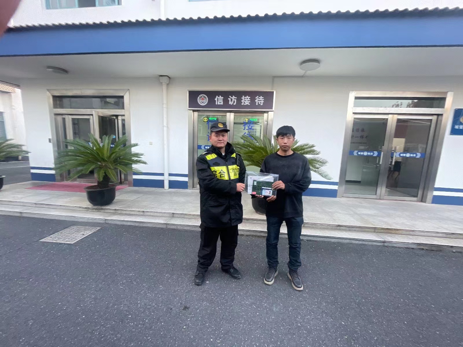 11月22日16:25,宗保公司駐浦東新區南碼頭網(wǎng)格項目員工徐寶輝在高科西路浦三路巡邏時(shí),撿到一部白色蘋(píng)果13手機,隨即報告了帶班組長(cháng),并按指示邊巡邏邊等待失主聯(lián)系。不一會(huì )兒,一位女士打來(lái)電話(huà),語(yǔ)氣顯得非常著(zhù)急。徐寶輝一邊安慰女士,一邊與她約好碰面時(shí)間地點(diǎn)。很快,一位身穿黑衣的女士趕到現場(chǎng),核實(shí)確認該女士是失主后,徐寶輝就將手機交還給了她。為表示感謝女士要發(fā)微信紅包給徐寶輝,被他婉言謝絕了。