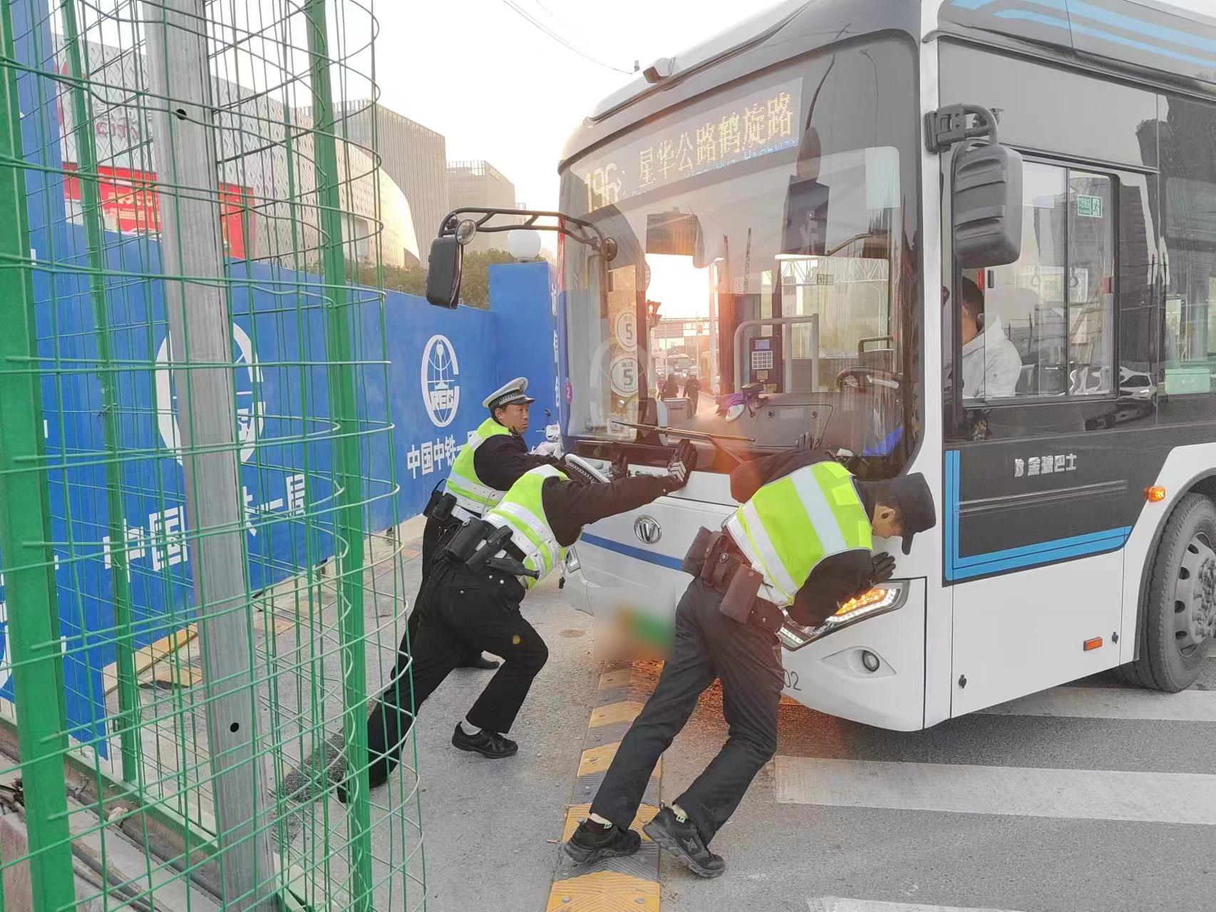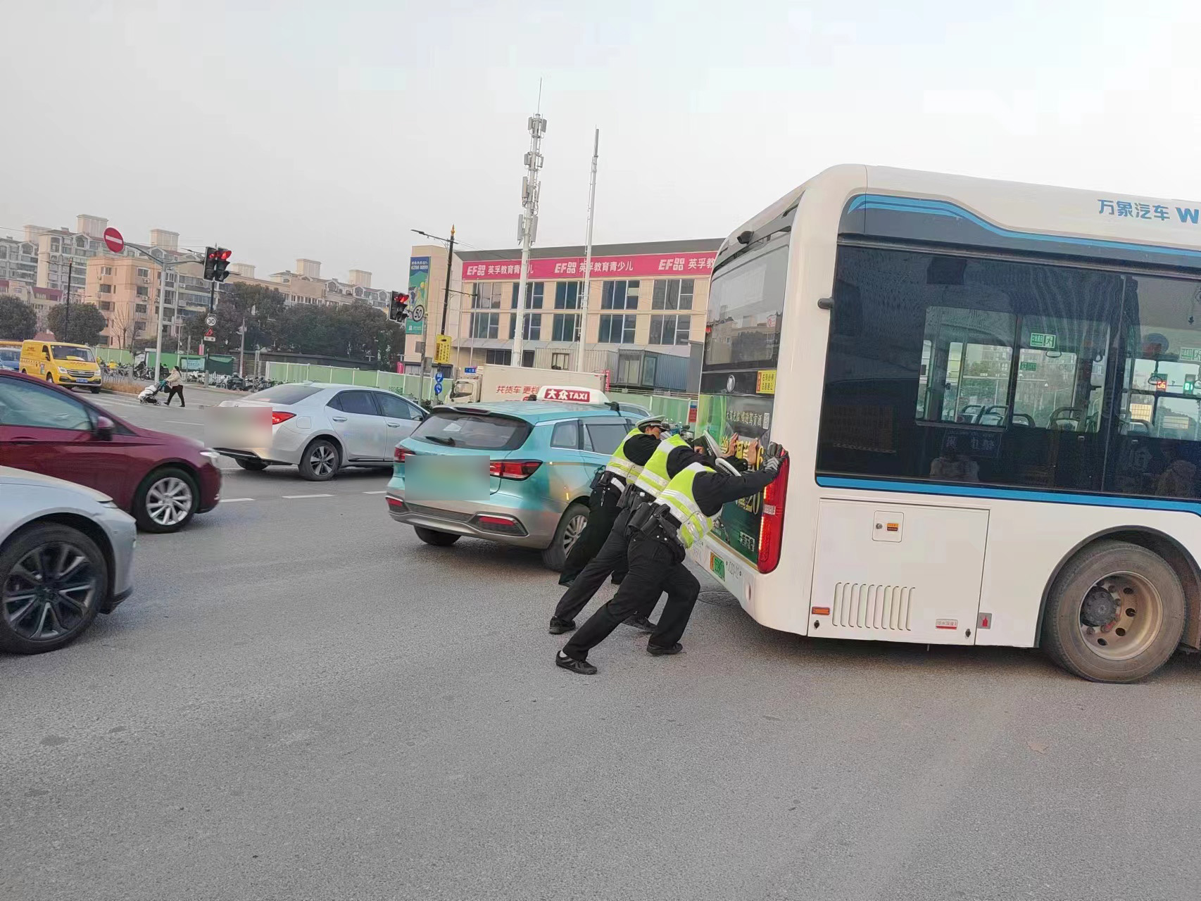 兩人見(jiàn)狀上前詢(xún)問(wèn),原來(lái)公交車(chē)發(fā)生故障無(wú)法啟動(dòng)??紤]到公交車(chē)停在馬路中間,不但影響其他車(chē)輛的正常通行,還存在一定的安全隱患,于是兩人與公交車(chē)駕駛員商量后,就立即呼叫附近崗位同事前來(lái)幫忙推車(chē)。
