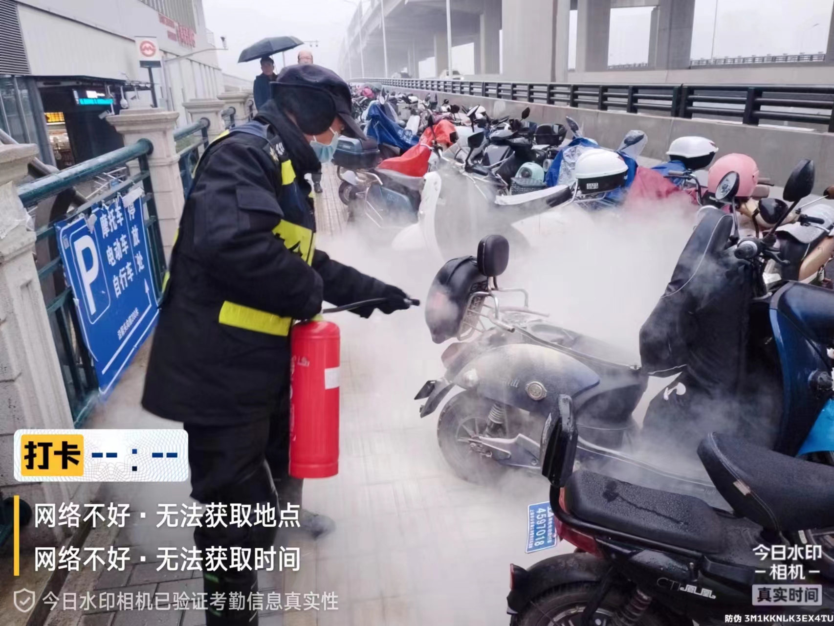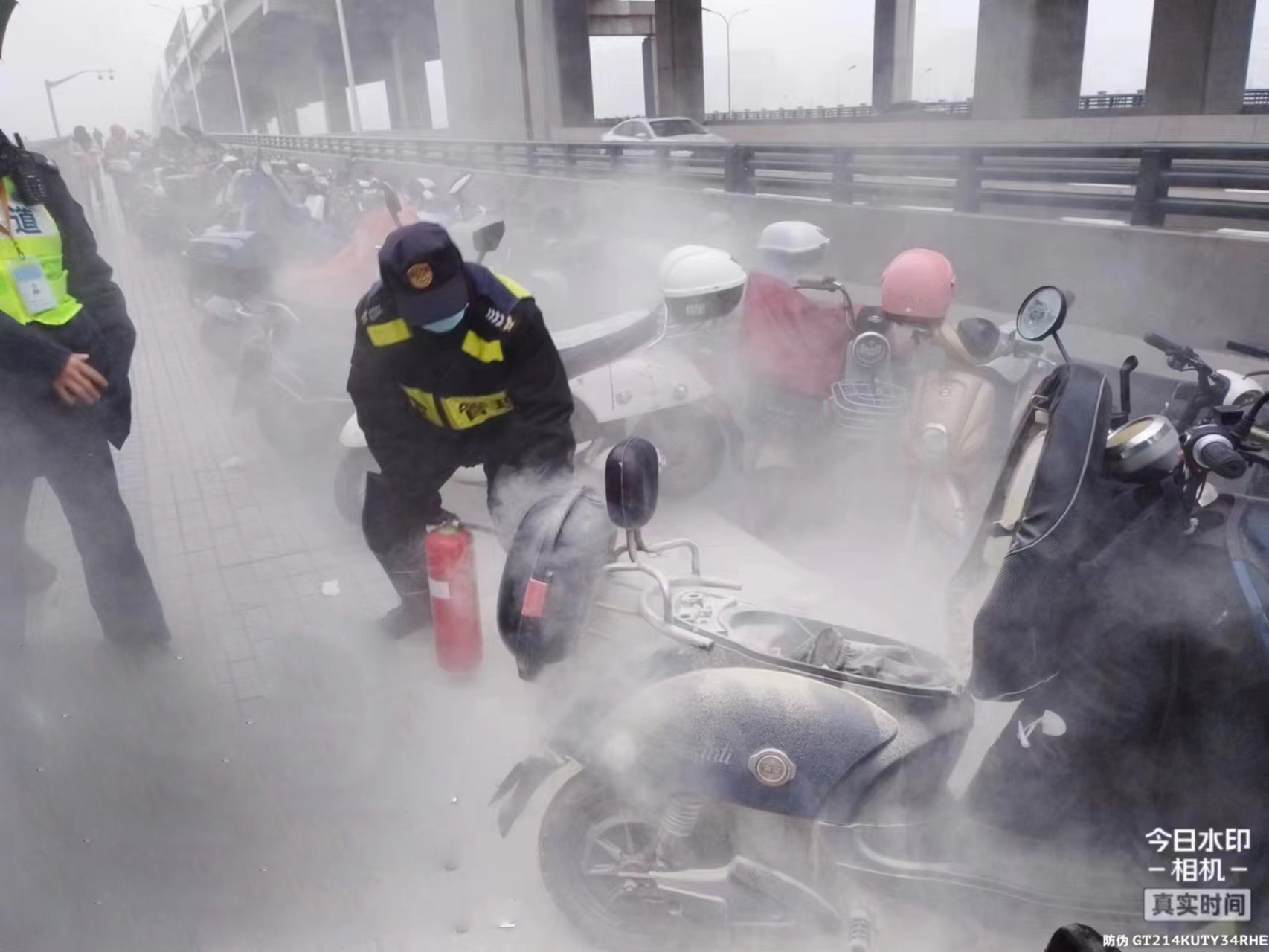 此時(shí),電瓶車(chē)已冒起白煙,并不斷有火苗竄出,一旦電瓶爆炸極易發(fā)生危險。徐雷趕緊請周?chē)罕姳茏專(zhuān)S后拿起滅火器對準電瓶車(chē)持續噴射,很快冒火部位被撲滅,避免了危險事故發(fā)生。