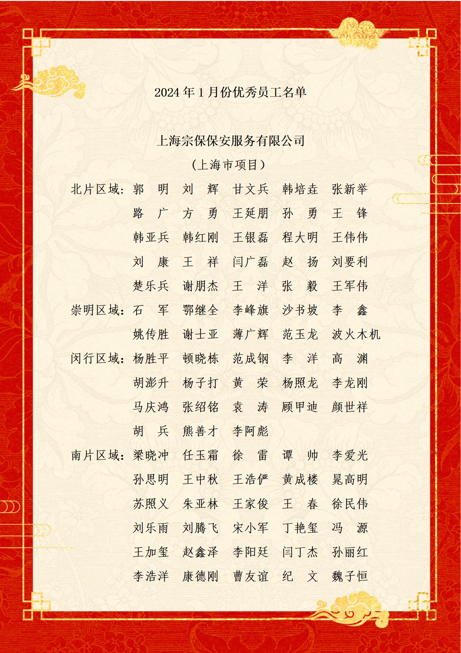 1月份,公司廣大員工根據甲方的任務(wù)要求,按照公司的部署安排,積極踐行公司“誠信為本 服務(wù)至上”的經(jīng)營(yíng)理念,持續發(fā)揚擔當盡責、善作善為的工作作風(fēng),助力完成了元旦小長(cháng)假南京歡樂(lè )谷安保秩序維護、浦東祝橋鎮2024年產(chǎn)業(yè)項目重點(diǎn)工程民生實(shí)事項目集中開(kāi)工儀式等多個(gè)大型活動(dòng)臨時(shí)保障任務(wù),全力配合甲方做好了城市管理輔助、治安巡邏聯(lián)防、物業(yè)服務(wù)保障、生態(tài)環(huán)境保護、高鐵線(xiàn)路巡防等工作。期間,涌現出了一批盡心履責、崗位建功、拾金不昧、熱心助人的優(yōu)秀員工和先進(jìn)典型。