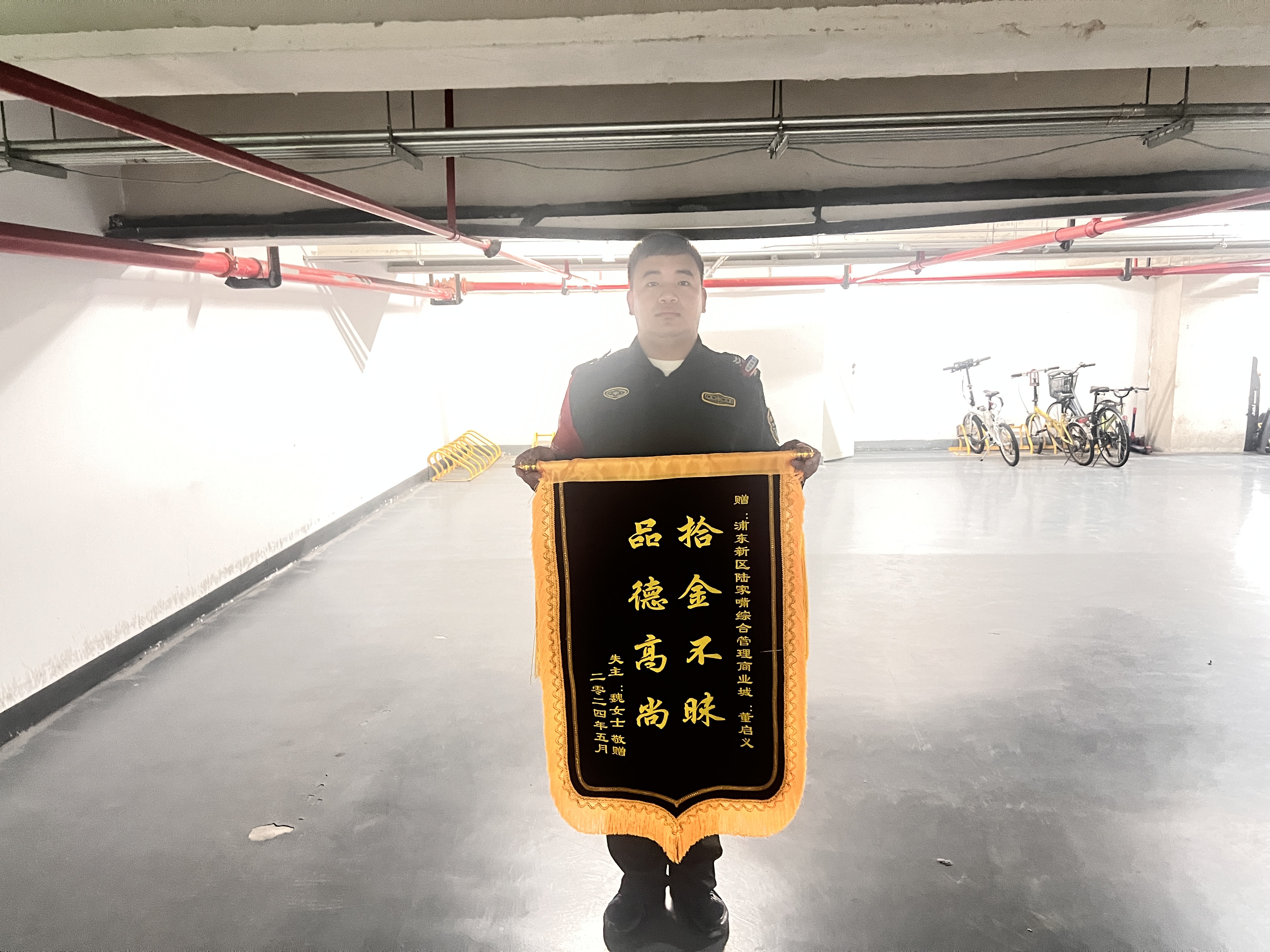 5月11日,宗保公司駐浦東新區陸家嘴綜合管理項目員工董啟義收到市民魏女士寄來(lái)的一面繡有“拾金不昧 品德高尚”的錦旗,贊揚他拾金不昧的助人行為。