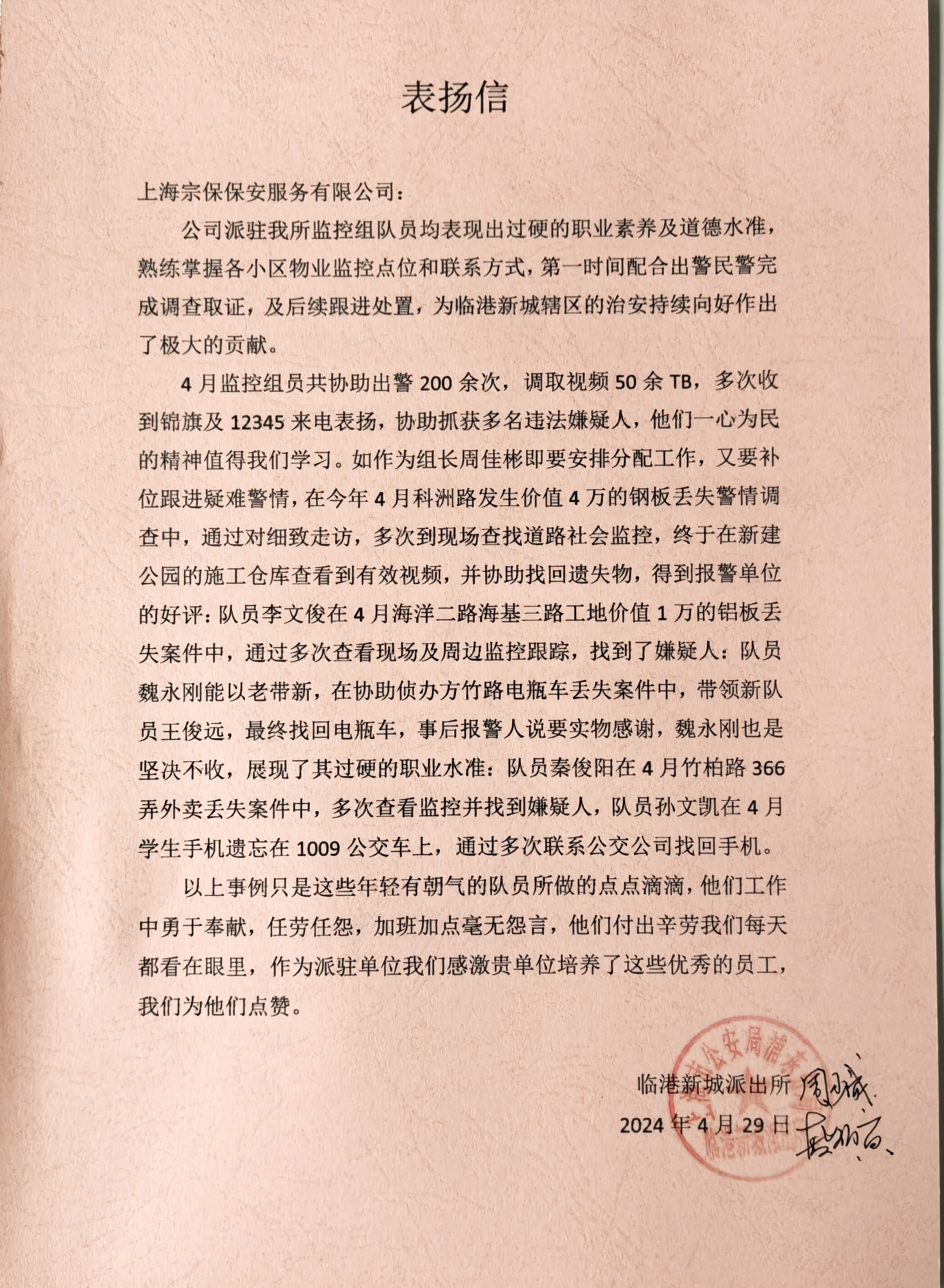 5月2日,宗保公司駐浦東新區臨港新城派出所輔助項目收到派出所的表?yè)P信,對項目員工出色的工作表現給予了表?yè)P。