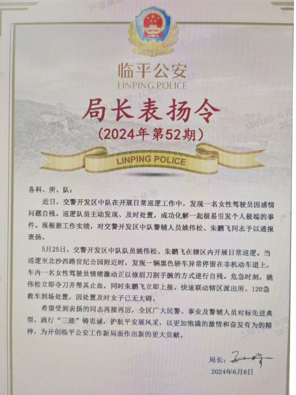 6月6日,浙江民泰公司駐杭州市臨平區公安分局東湖交管輔助項目收到分局孫琦局長(cháng)簽發(fā)的2024年第52期《局長(cháng)表?yè)P令》,對公司員工朱鵬飛協(xié)助勸阻割腕女青年,成功化解一起極端事件的出色表現給予表?yè)P。