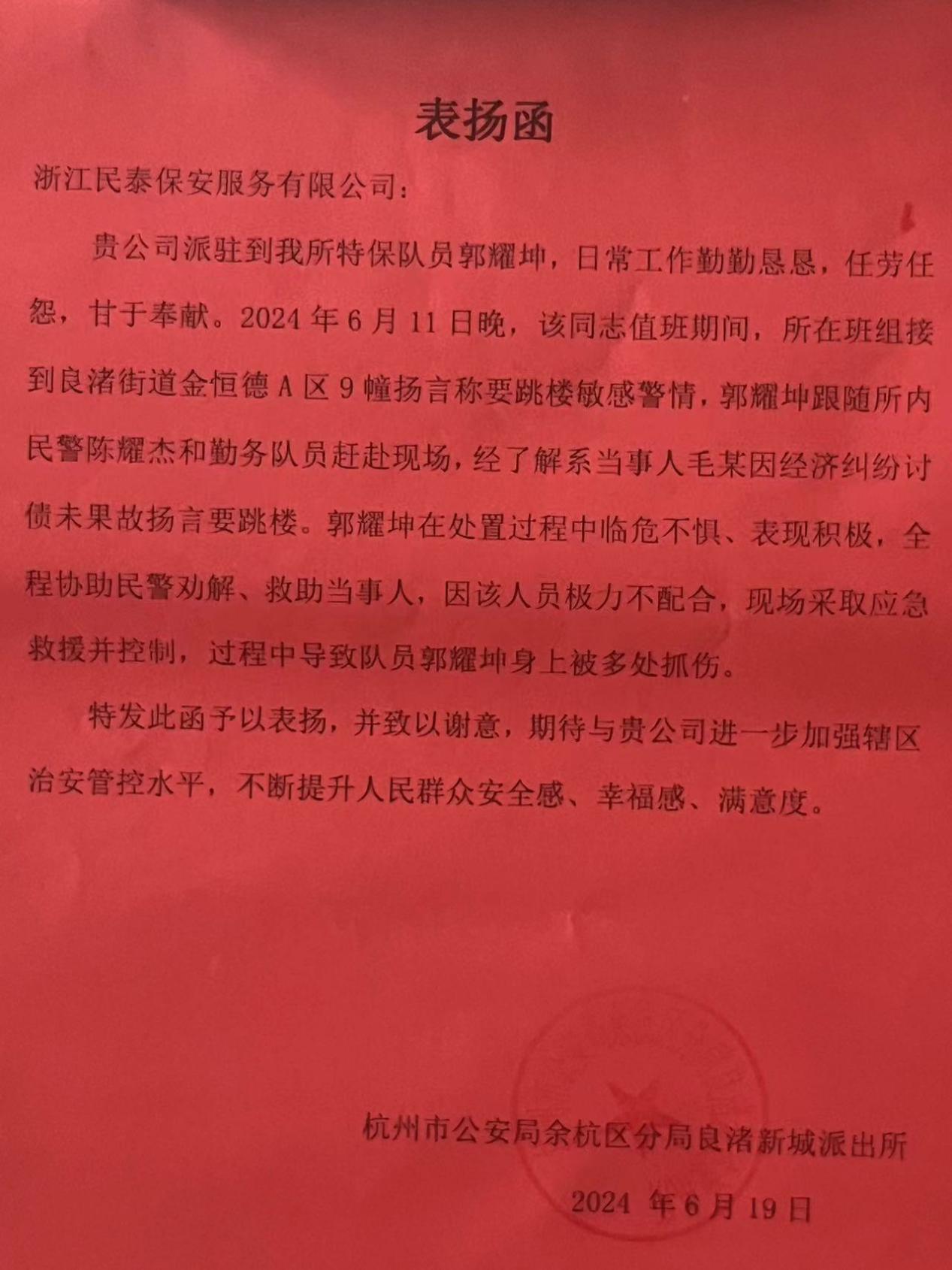 6月19日,浙江民泰公司駐杭州市余杭區公安分局良渚新城派出所輔助項目員工郭耀坤收到良渚新城派出所的一封表?yè)P信,信中對他在輔助執法過(guò)程中面對當事人的推搡抓挖,打不還手、規范執法、自律克制的行為給予表?yè)P。