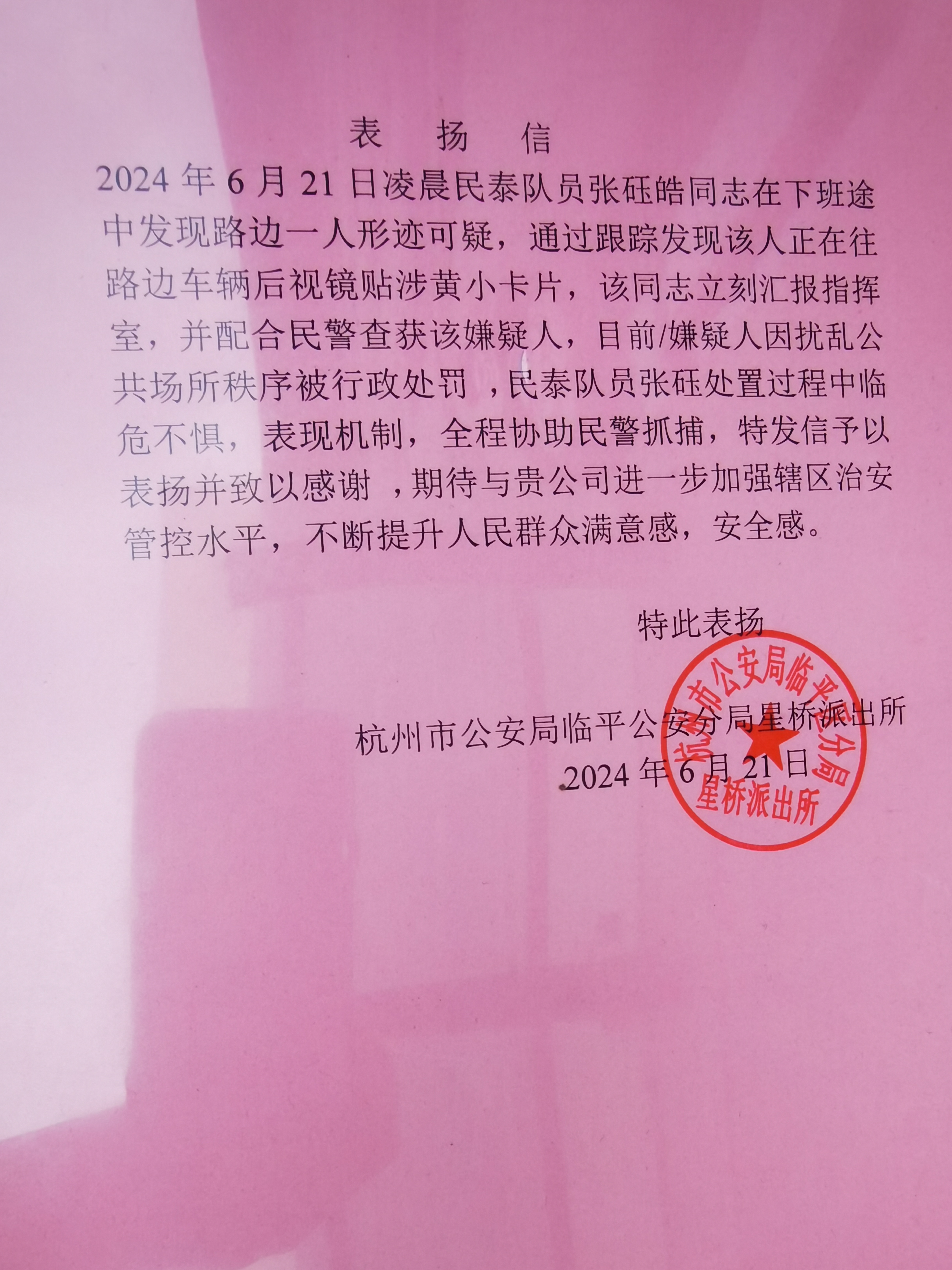 6月21日,浙江民泰公司駐杭州市臨平區公安分局星橋派出所輔助項目收到星橋派出所的一封表?yè)P信,表?yè)P公司員工張砡皓觀(guān)察入微警覺(jué)性高、時(shí)時(shí)牢記職責,下班途中協(xié)助派出所抓獲涉黃廣告“黑手”的擔當作為精神。