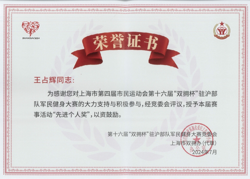 7月4日至7月14日,由上海市雙擁辦、上海警備區政治工作局、上海市體育局、上海市擁軍優(yōu)屬基金會(huì )主辦的以“牢記使命礪精兵,健身強軍爭第一”為主題的第十六屆“雙擁杯”駐滬部隊軍民健身大賽開(kāi)賽,宗保公司作為退役軍人創(chuàng )辦企業(yè)參加大賽。