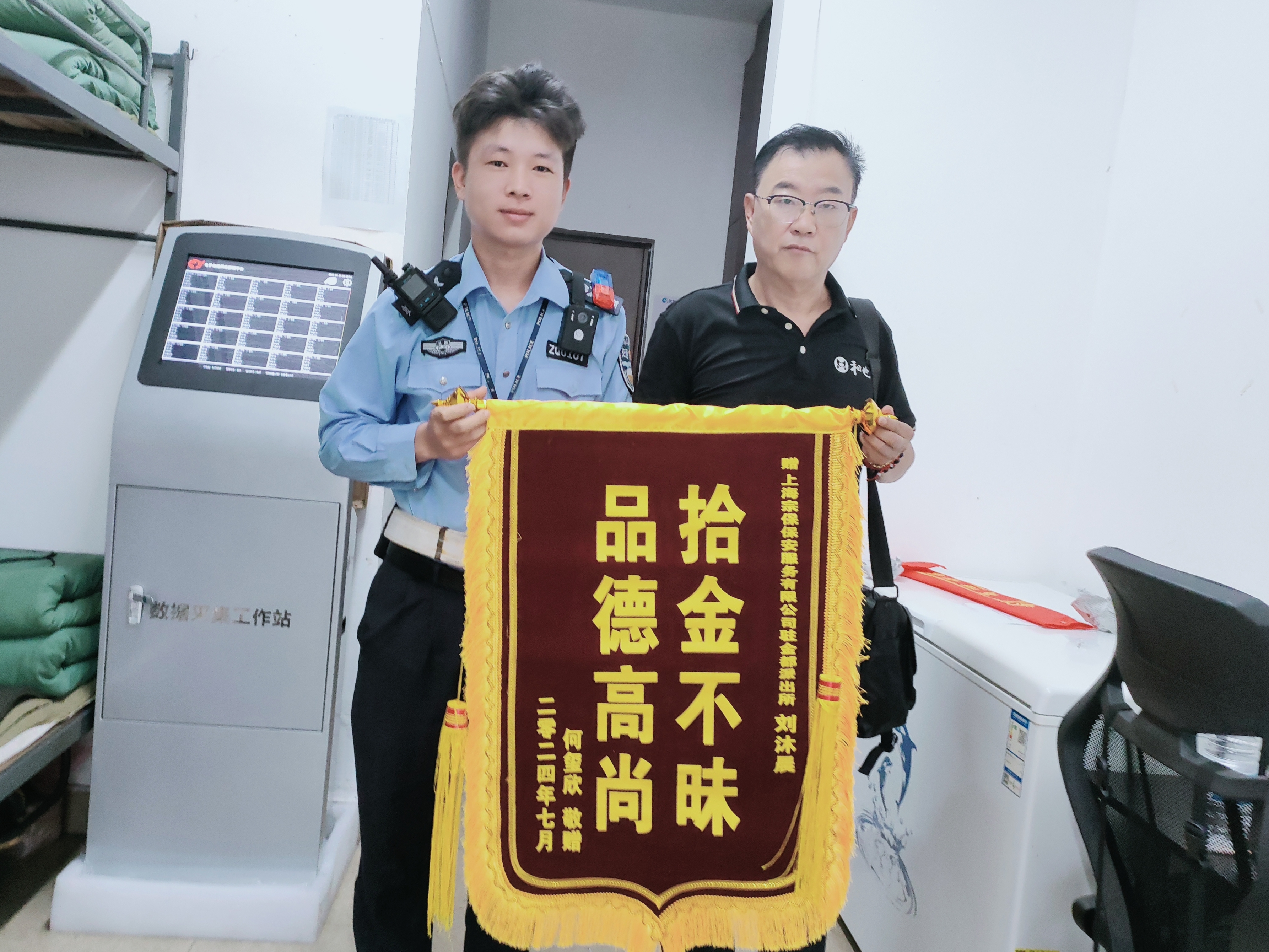 8月8日,宗保公司駐閔行區莘莊工業(yè)區項目員工收到市民何先生送來(lái)的一面繡有“拾金不昧 品德高尚”的錦旗,感謝公司員工劉沐晨受托將7800元現金等物品轉交給自己的熱心行為。