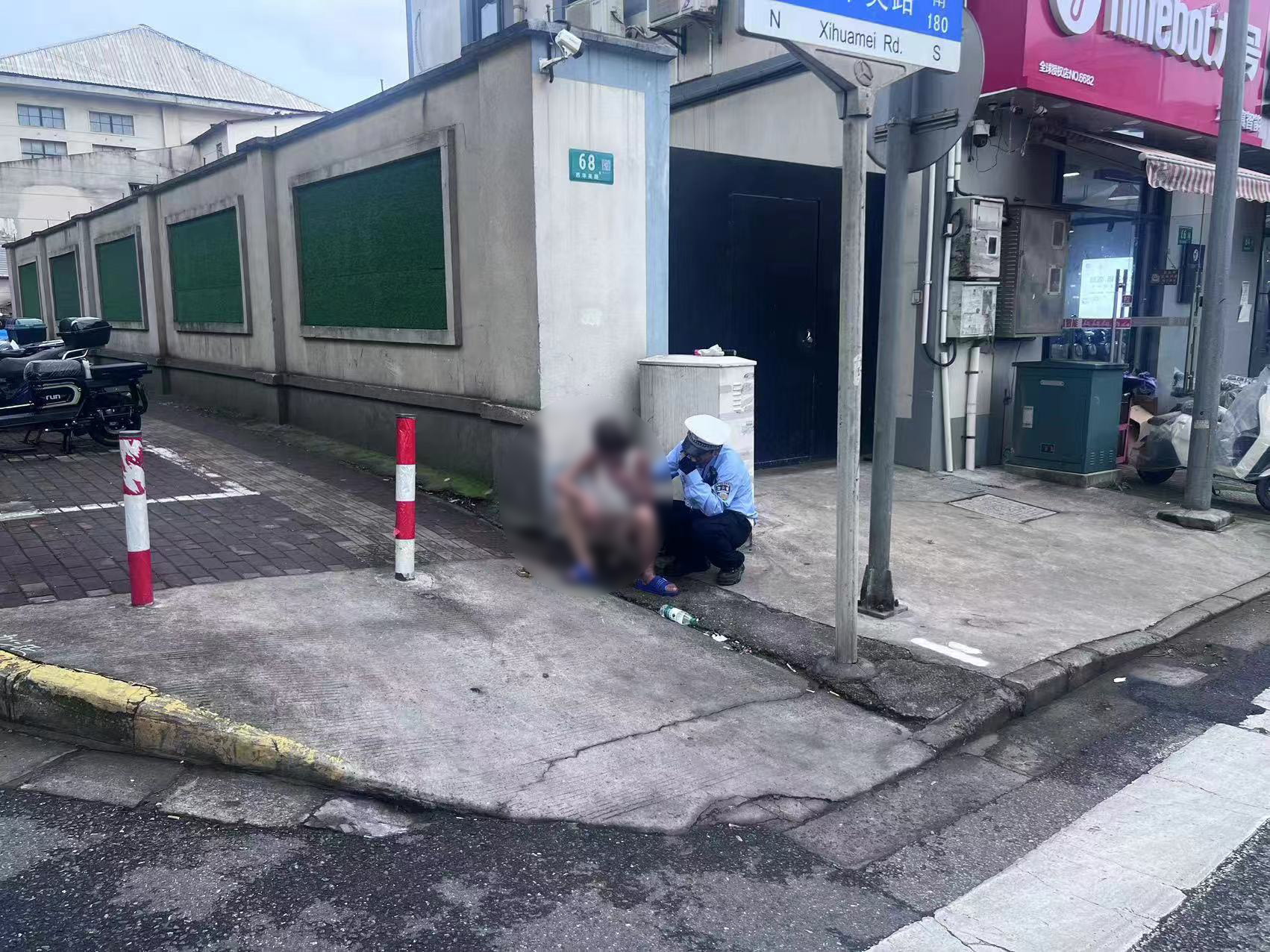 人行道硬化,曬了一天地表溫度高。為防止意外,楊智豪將現場(chǎng)情況報告了項目負責人和派出所值班室,按指示守護在老人身旁。這時(shí),老人也清醒了想起來(lái),楊智豪馬上將老人扶坐起來(lái),并將自己帶的礦泉水給老人喝下。