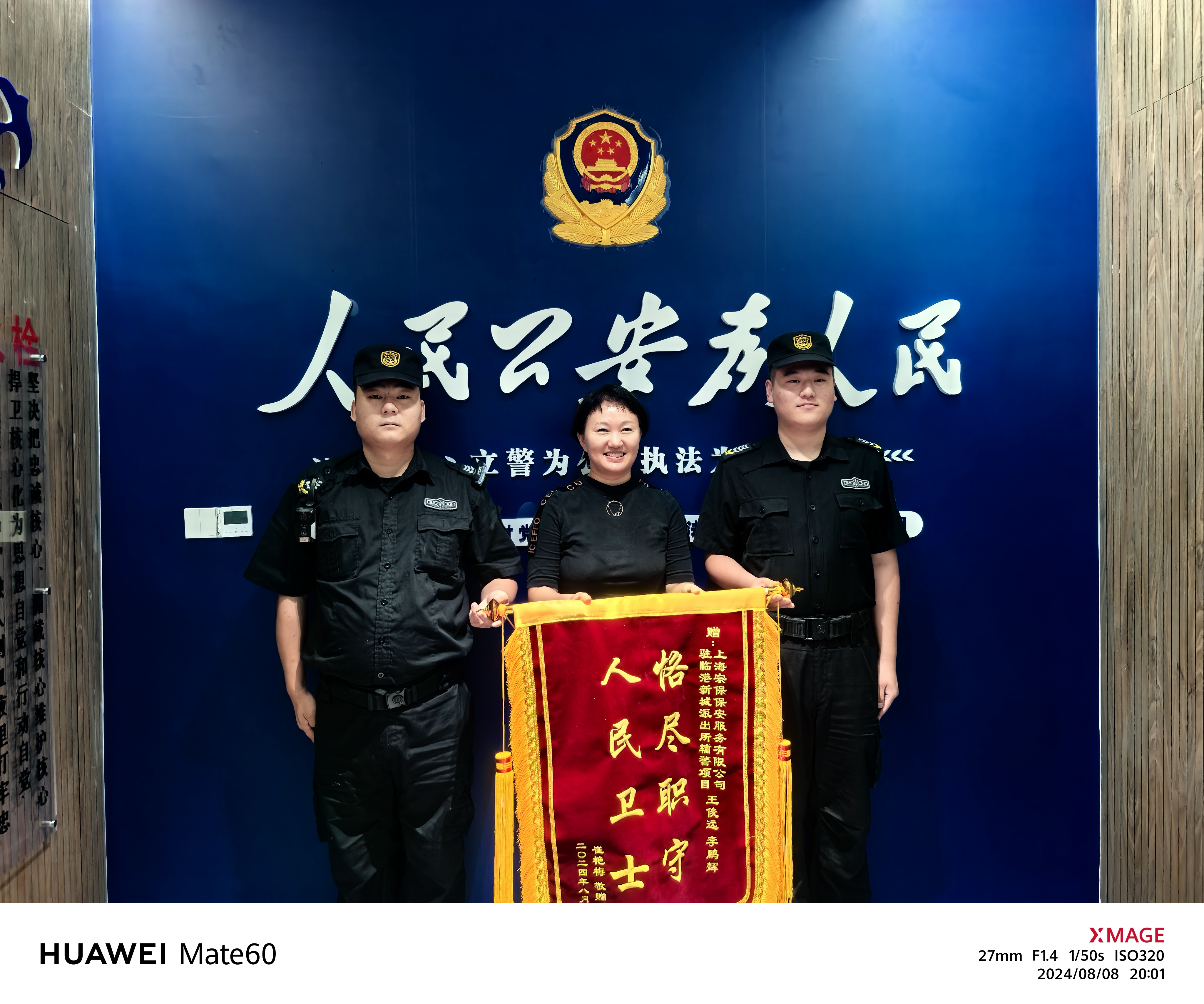 8月8日,宗保公司駐浦東新區臨港新城派出所輔助項目員工收到市民崔女士贈送的一面繡有“恪盡職守 人民衛士”的錦旗,感謝公司員工王俊遠和李鵬輝幫助其女兒張女士的擔當助人行為。