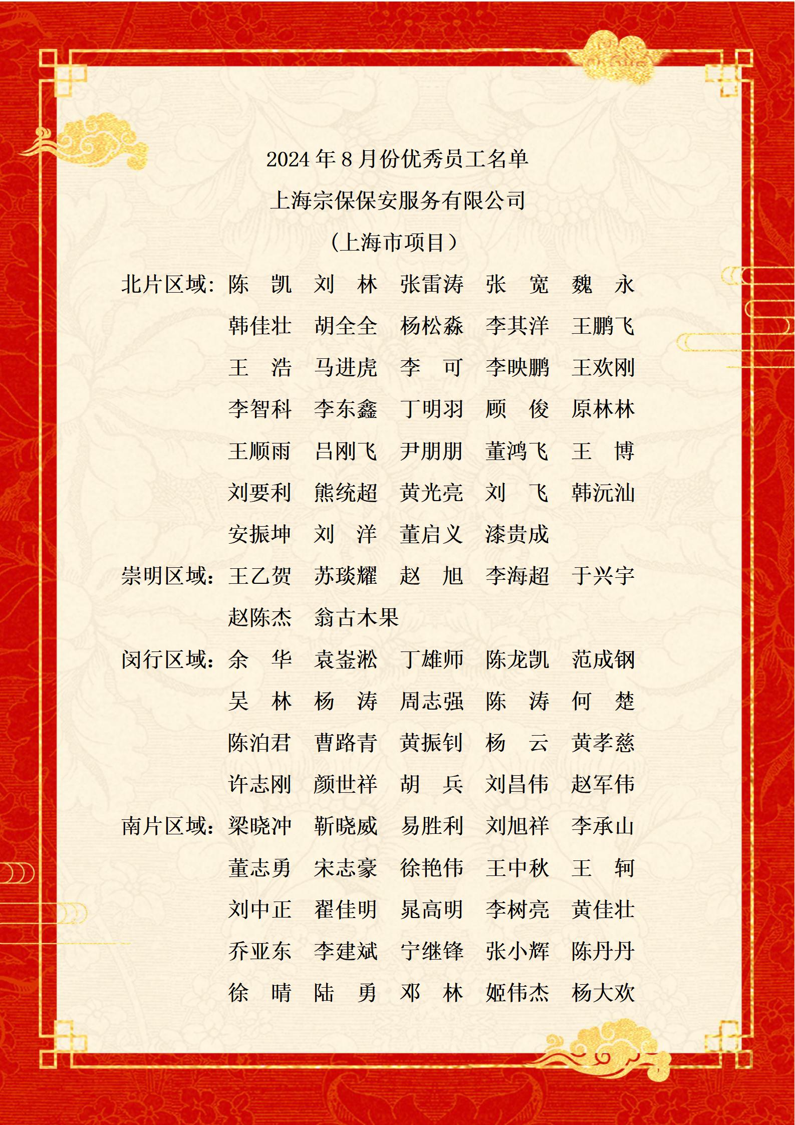 8月份,公司廣大員工根據甲方的任務(wù)要求,按照公司的部署安排,積極踐行公司“誠信為本 服務(wù)至上”的經(jīng)營(yíng)理念,戰高溫、斗酷暑,助力完成了劉德華2024巡回演唱會(huì )—杭州站和圖靈集市上海海港足球之夜等多個(gè)大型活動(dòng)臨時(shí)保障任務(wù),全力配合甲方做好了城市管理輔助、治安巡邏聯(lián)防、物業(yè)服務(wù)保障、生態(tài)環(huán)境保護、高鐵線(xiàn)路巡防等工作。期間,涌現出了一批盡心履責、崗位建功、拾金不昧、熱心助人的優(yōu)秀員工和先進(jìn)典型。